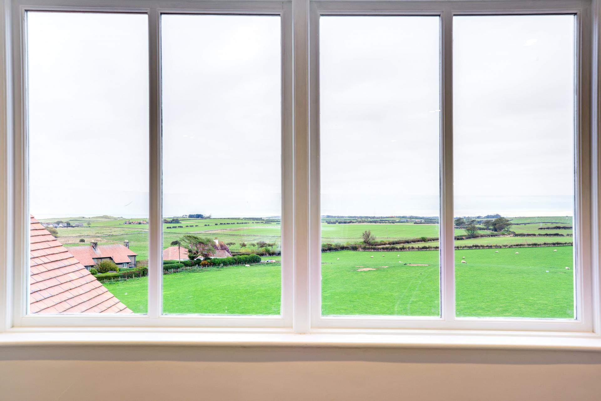 Cornicing, shallow cupboard, oak flooring, two wall mounted 'Rointe' electric thermostatic heaters with bluetooth control, views towards The Cheviots, Seahouses, The Farne Islands and Bamburgh Castle. Door through to...