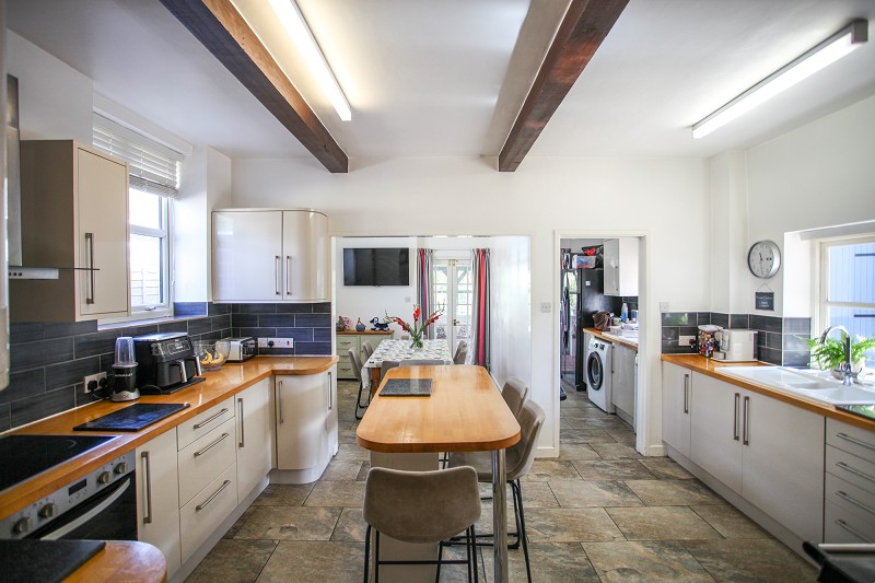 Whilst offering over 3500 square feet of accommodation, the property has a distinctly cottage feel with many exposed beams and roof timbers and flagstone and tiled floors. There are two large reception rooms, one with a homely woodburning stove, a stylish fitted kitchen with a central island breakfast bar formed in part open-plan with the dining room. There is a separate utility room and a garden room taking full advantage of the morning sun.