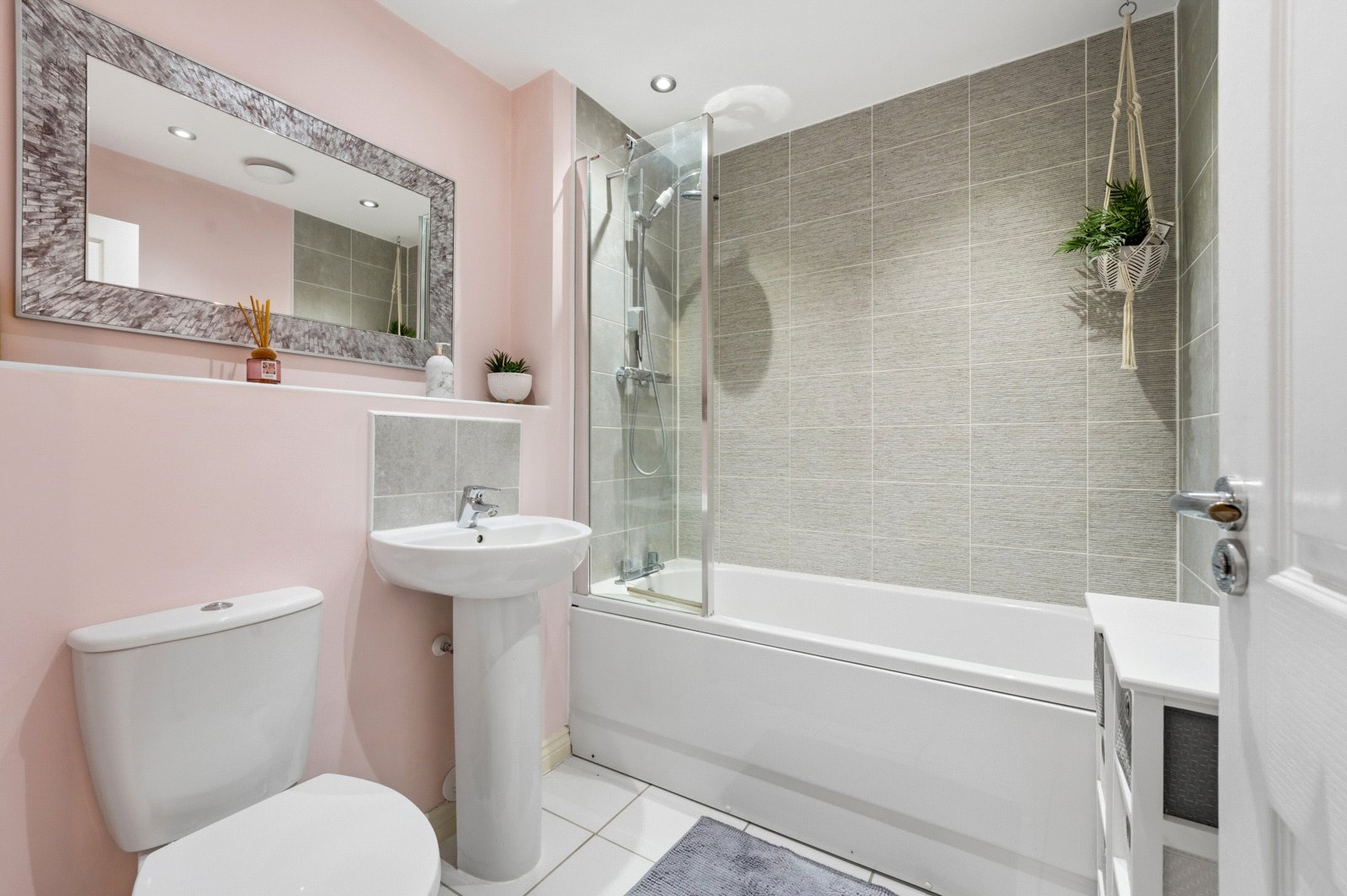 Bathroom: Fitted with a white suite comprising a panelled bath with separate shower over, pedestal wash hand basin, low-level WC, part-tiled walls and tiled floor.