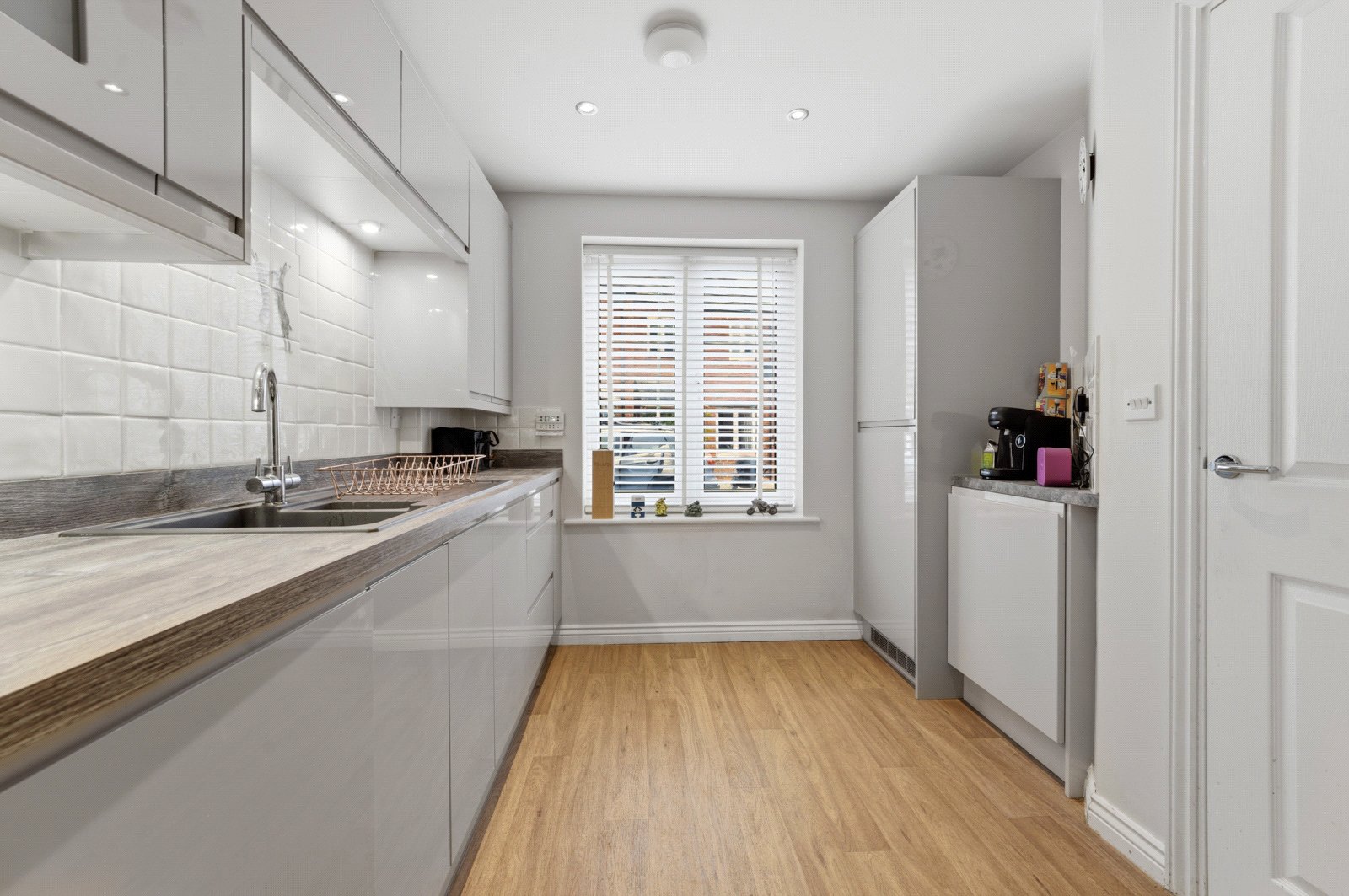 Wren Kitchen: Fitted with a range of matching wall and base units with integrated appliances, including an electric ceramic hob with extractor hood above, separate oven with microwave, fridge/freezer, dishwasher and washer/dryer. Wall-mounted cupboard housing the central heating boiler. Double-glazed window to the front aspect.