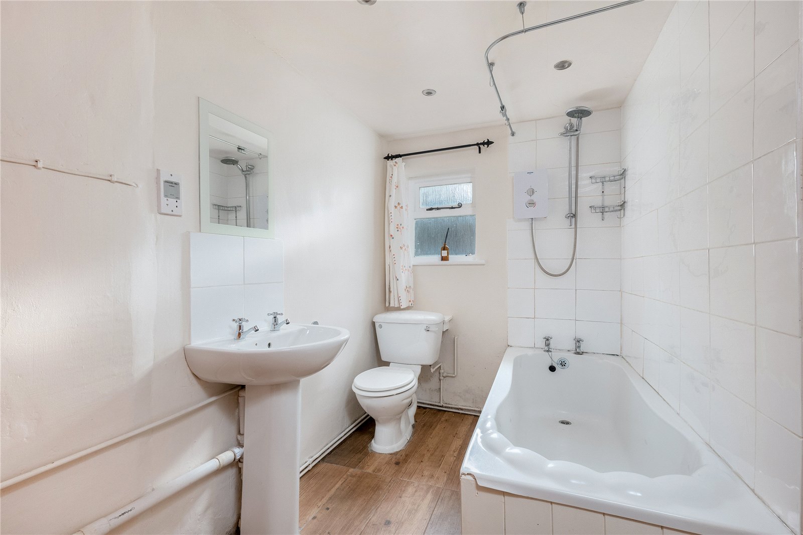 Bathroom: Comprising white suite of panelled bath with shower over, pedestal wash-hand basin, low-level WC, part-tiled walls, wooden floor, window to rear aspect, and built-in cupboard with plumbing for a washing machine.
