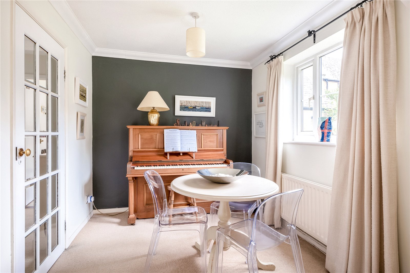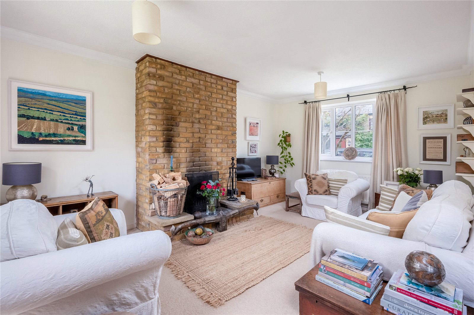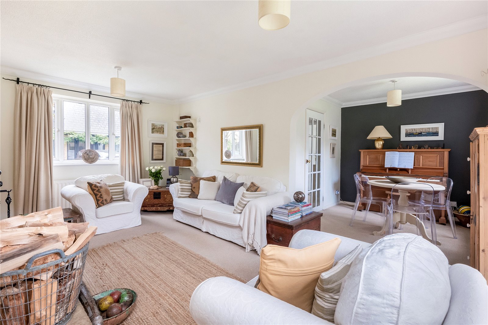 L Shaped Sitting/Dining Room Attractive open brick fireplace with raised slab hearth, double glazed windows to front and rear aspect, double glazed French doors to the rear garden.