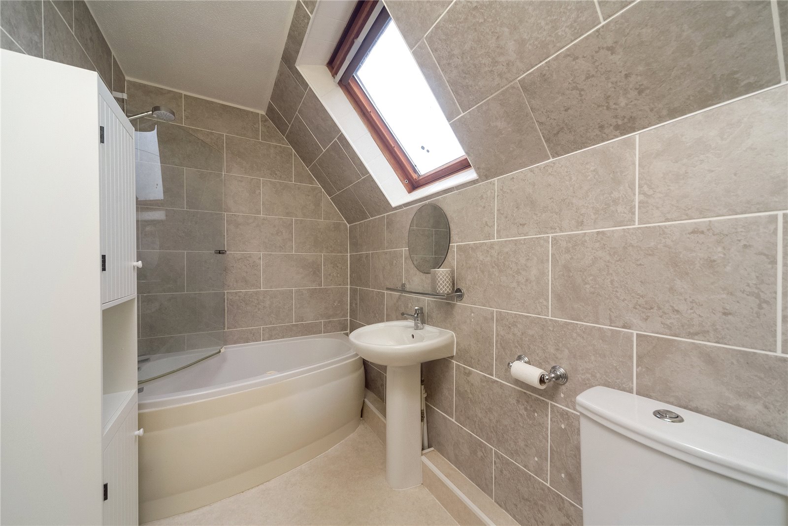 Comprising White Suite of Panelled Bath with Separate Shower Over. Pedestal Hand Wash Basin, Low Level WC. Part Tiled Walls. Double Glazed Velux Window to Front Aspect.