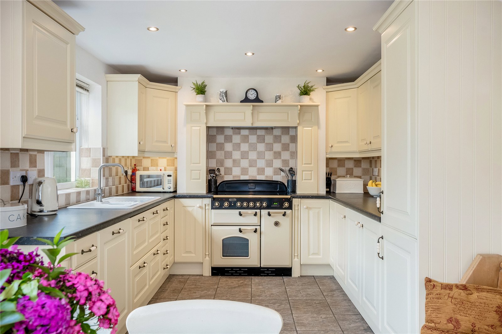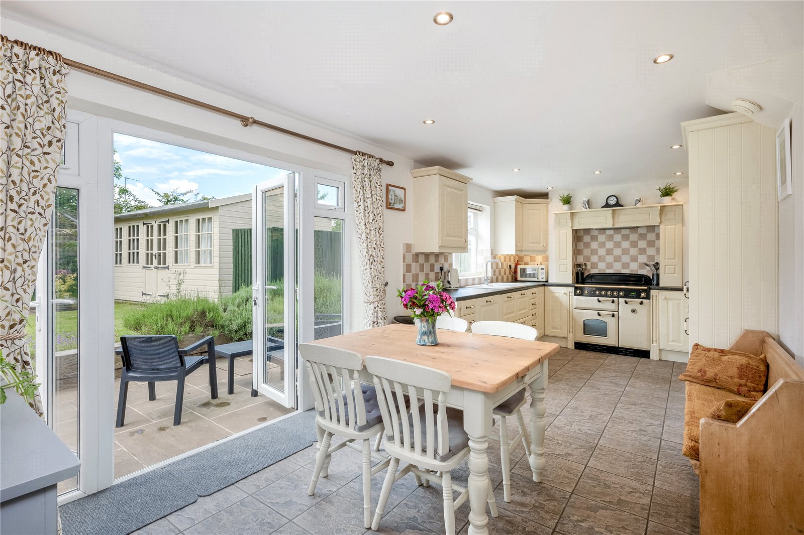 With Tiled Flooring, Double Glazed French Patio Doors Leading out onto Rear Garden. A Range of Matching Wall and Base Units, Electric Rangemaster, Integrated Fridge Freezer, Dishwasher and 1 ½ Bowl Sink. Double Glazed Window to Rear Aspect.