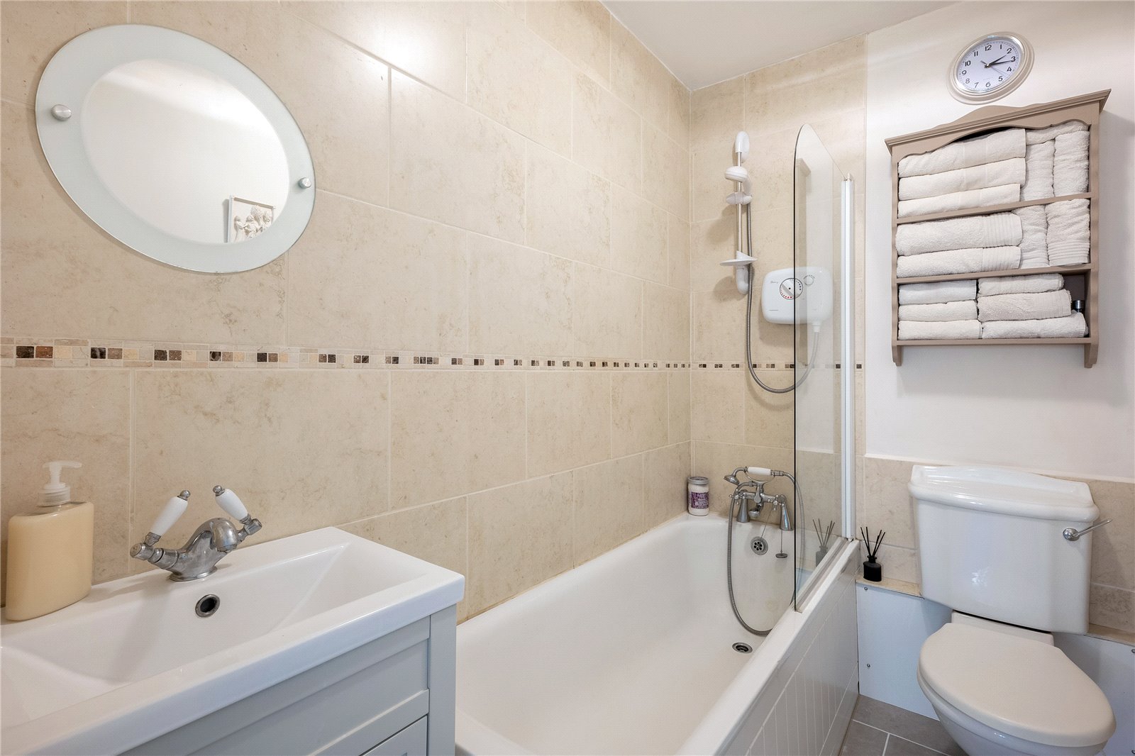 With Tiled Floor, Panelled bath with Wall Mounted Shower, Low Level WC and Hand Wash Basin.