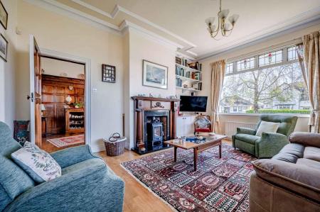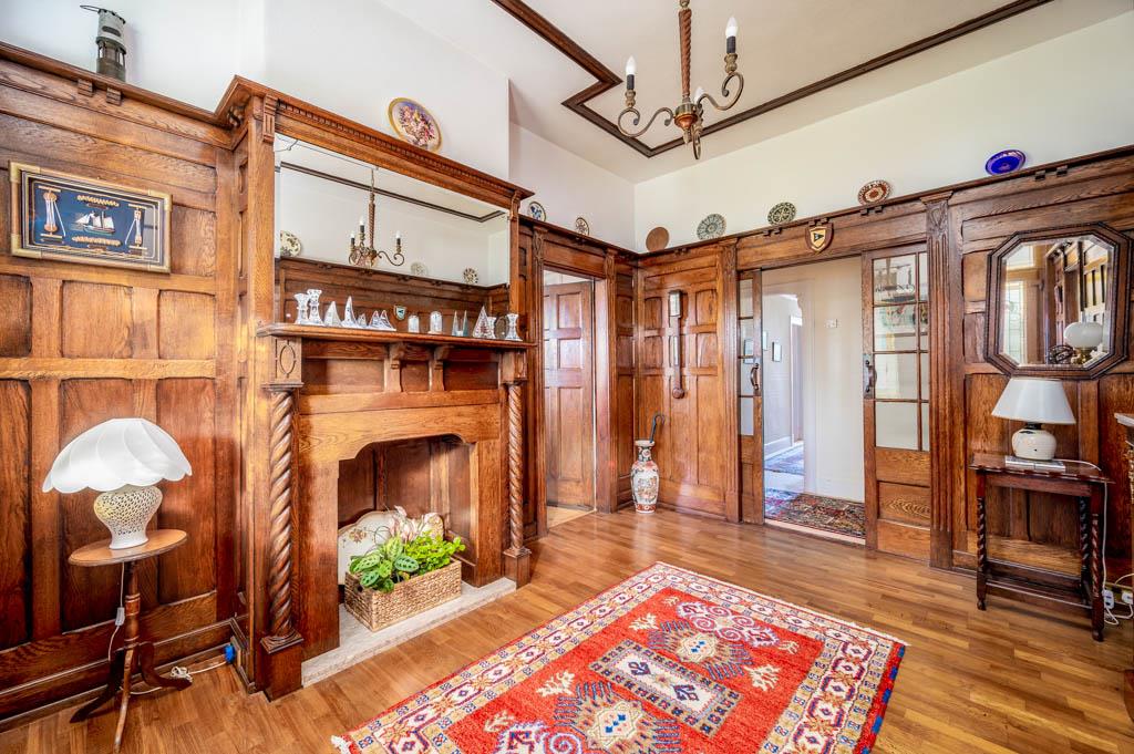 - Living Room with Attractive Carved Fireplace, Cast Iron Wood Burning Stove and Stained Glass Top Lights