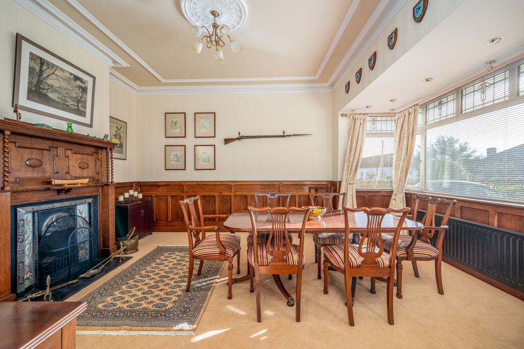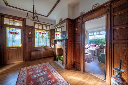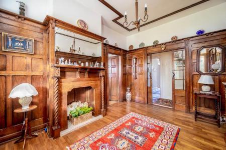 - Family Room with Attractive Carved Wooden Fireplace Surround, Open Fire and Stained Glass Top Lights