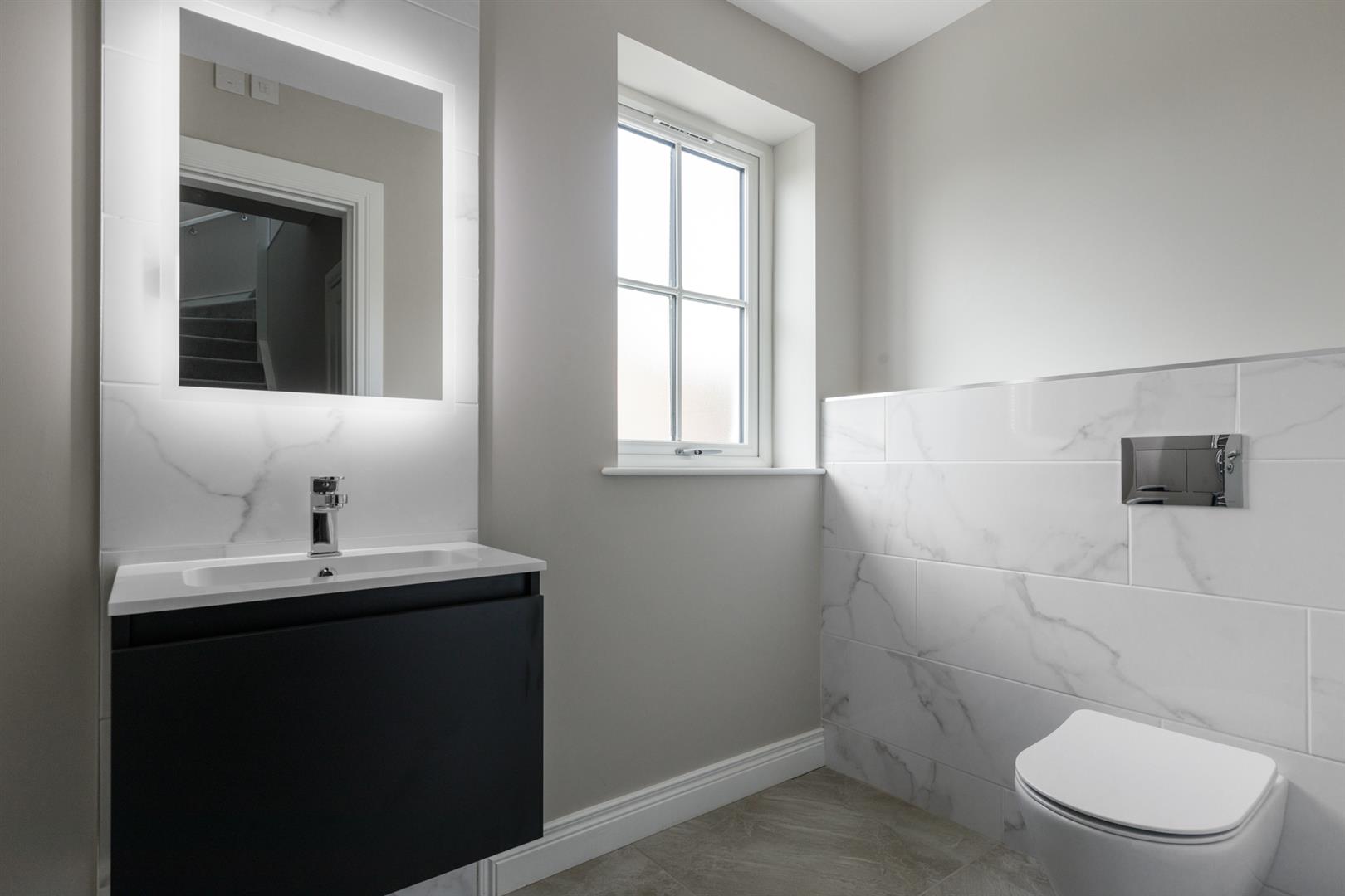 Wc/Cloakroom: - (2.51m x 1.5m) - With contemporary white suite comprising close coupled WC, floating vanity unit with chrome mixer taps and drawer unit below, illuminated mirror above and floor to ceiling tiling detail, part tiled walls, ceramic tiled floor, chrome heated towel rail, recessed LED spotlighting, extractor fan.