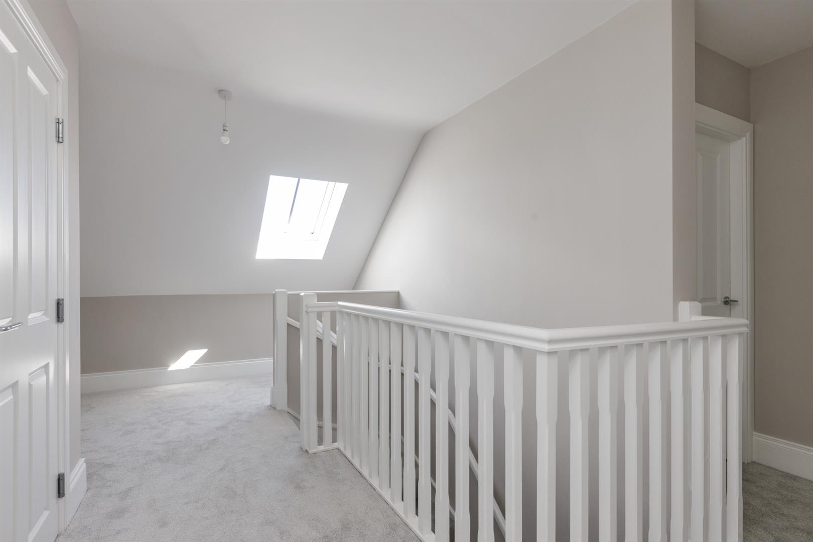 Spacious Landing: - () - With study area, Velux window with mature outlook across Crawfordsburn and Crawfordsburn Country Park to Belfast Lough mouth, Belfast Lough, the Antrim Hills and coastline, the Irish Sea and Scotland beyond, access hatch to roof void, large linen press with built-in shelving, hotpress with pressurised water cylinder, built-in shelving.