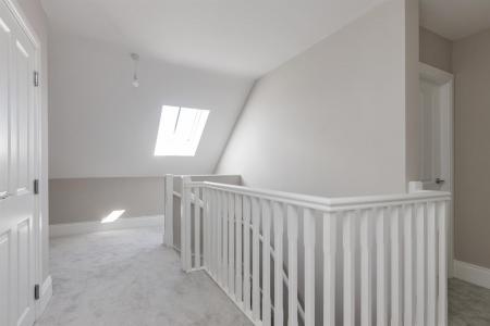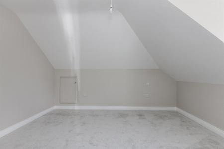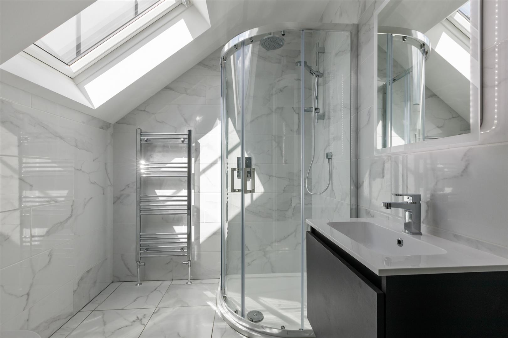 Ensuite Shower Room: - (1.85m x 1.73m) - With contemporary white suite comprising close coupled WC, floating vanity unit, chrome mixer taps, illuminated mirror above, chrome heated towel rail, built-in fully tiled shower cubicle with thermostatically controlled shower unit, overhead drencher and telephone hand shower, part fully tiled walls, ceramic tiled floor, Velux window, recessed LED spotlighting, extractor fan.