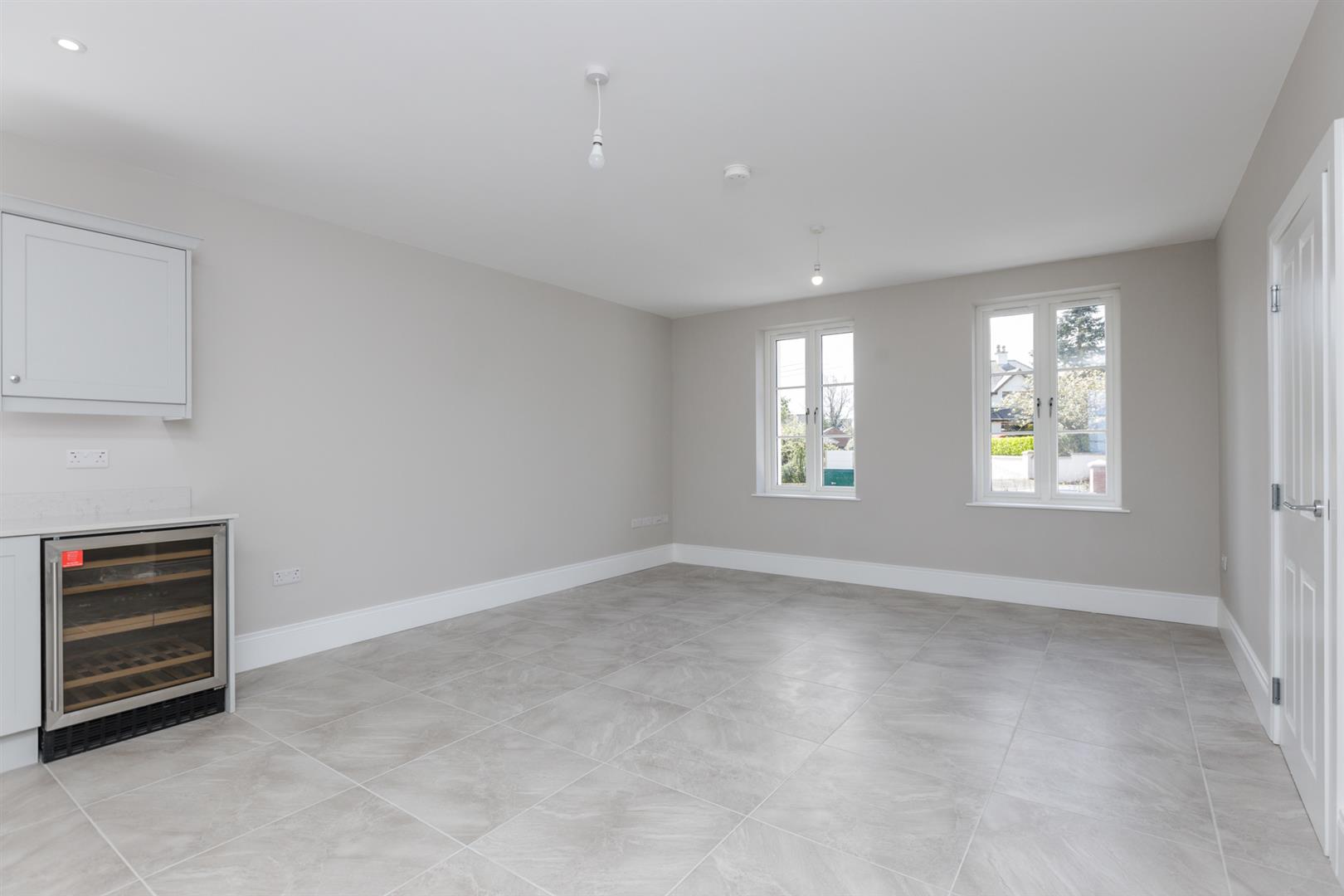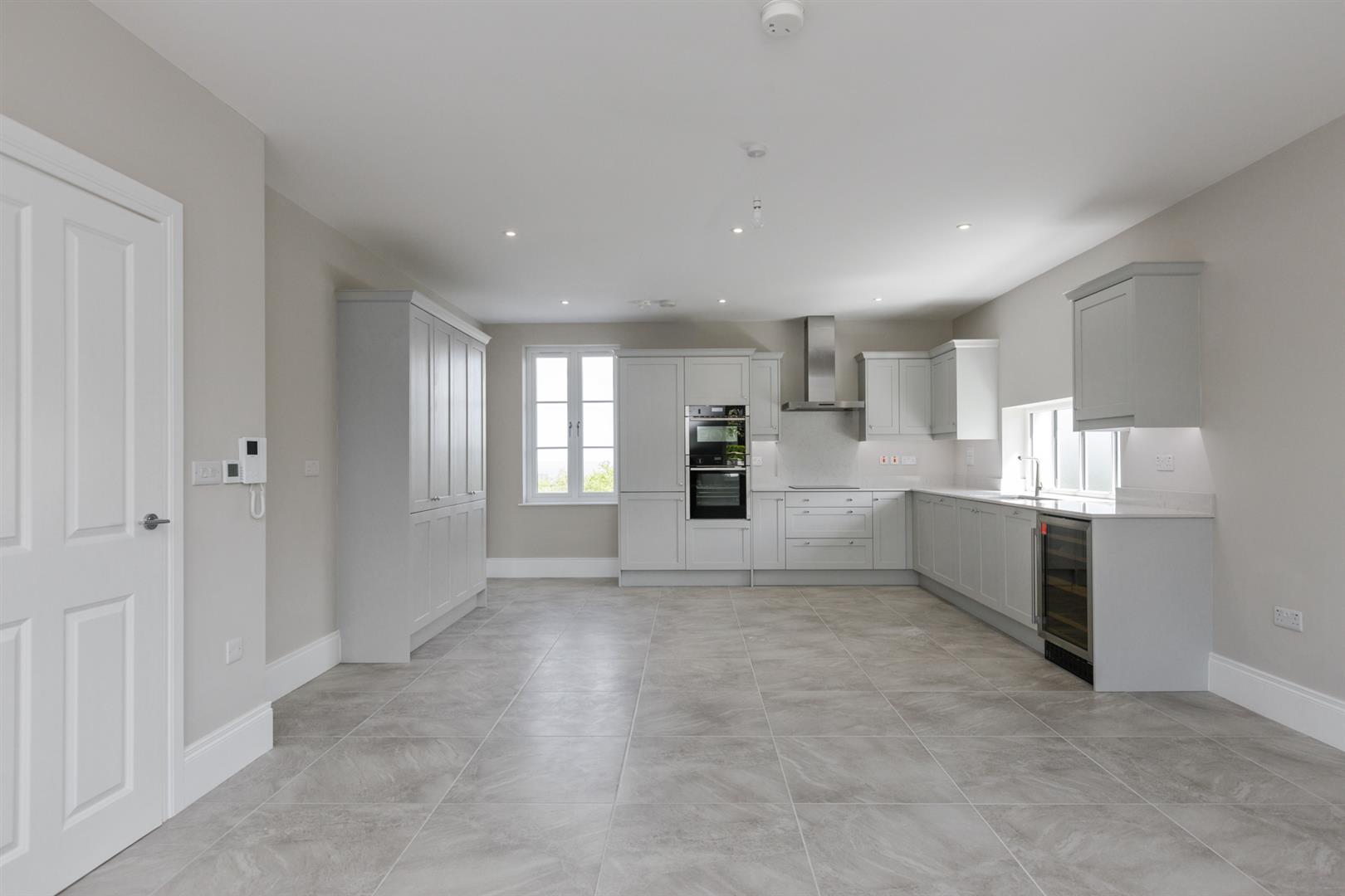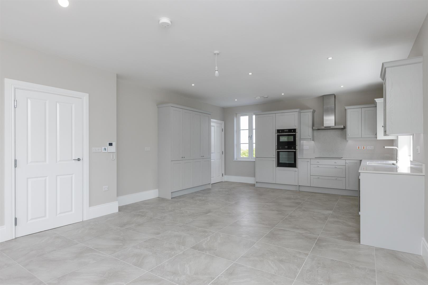Open Plan Kitchen/ Dining / Living Space: - (7.87m x 4.9m) - Bespoke fitted hand painted style Shaker kitchen with chrome fittings, quartz work surface, upstand and splashback, inset sink and a half stainless steel sink unit, integrated wine cooler, pull-out refuse drawer, integrated Neff dishwasher, integrated four ring Neff hob, quartz splashback, stainless steel extractor hood above, integrated Neff high level double ovens, integrated fridge freezer, built-in pantry cupboard with additional cabinetry, recessed LED spotlighting throughout, wall mounted temperature controls and intercom, ceramic tiled floor throughout, tri-aspect outlook with mature outlook to front and elevated outlook across Crawfordsburn and Crawfordsburn Country Park to the mouth of Belfast Lough, the Antrim Hills, coastline and Scotland beyond, access through to utility room.