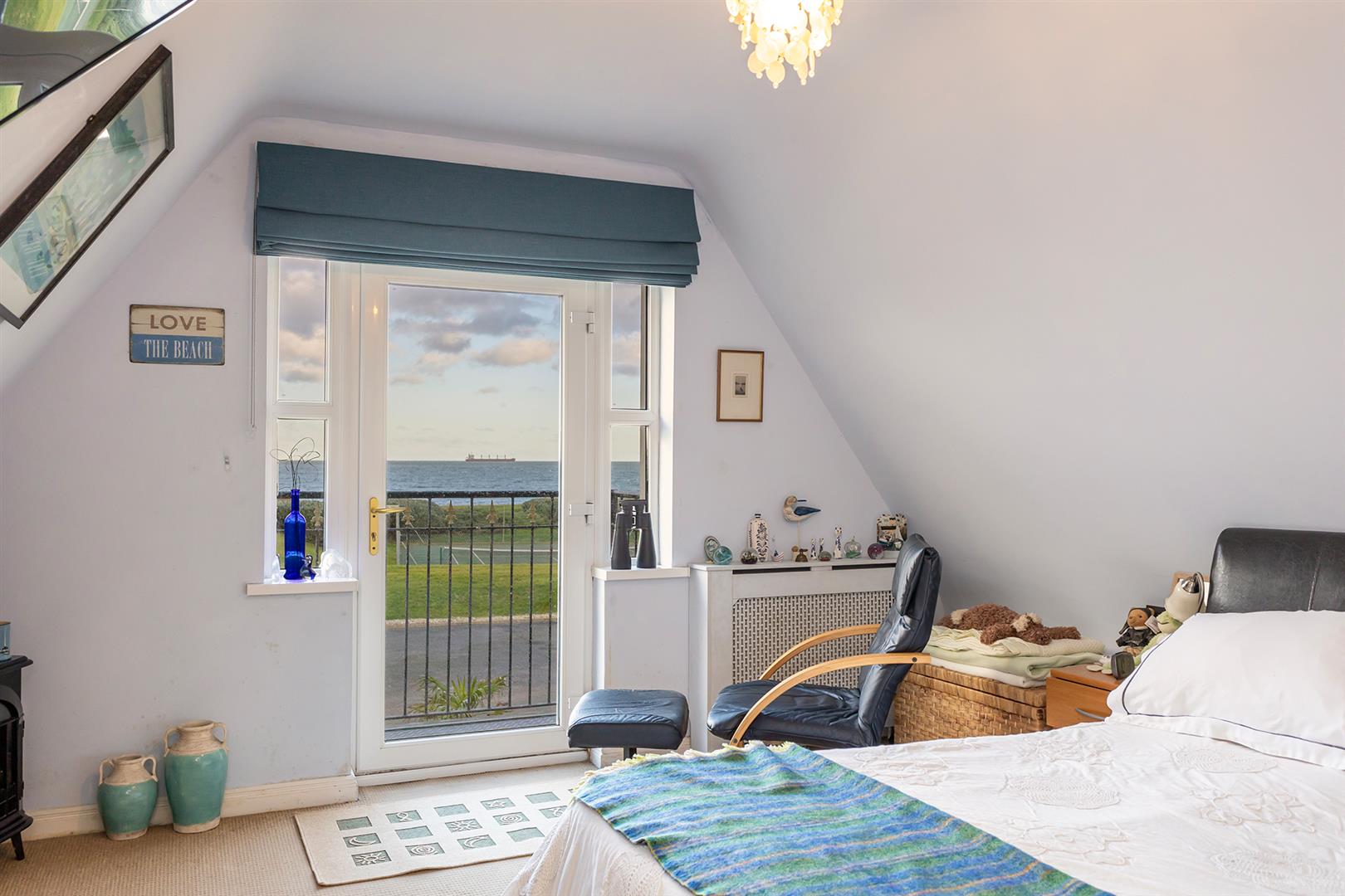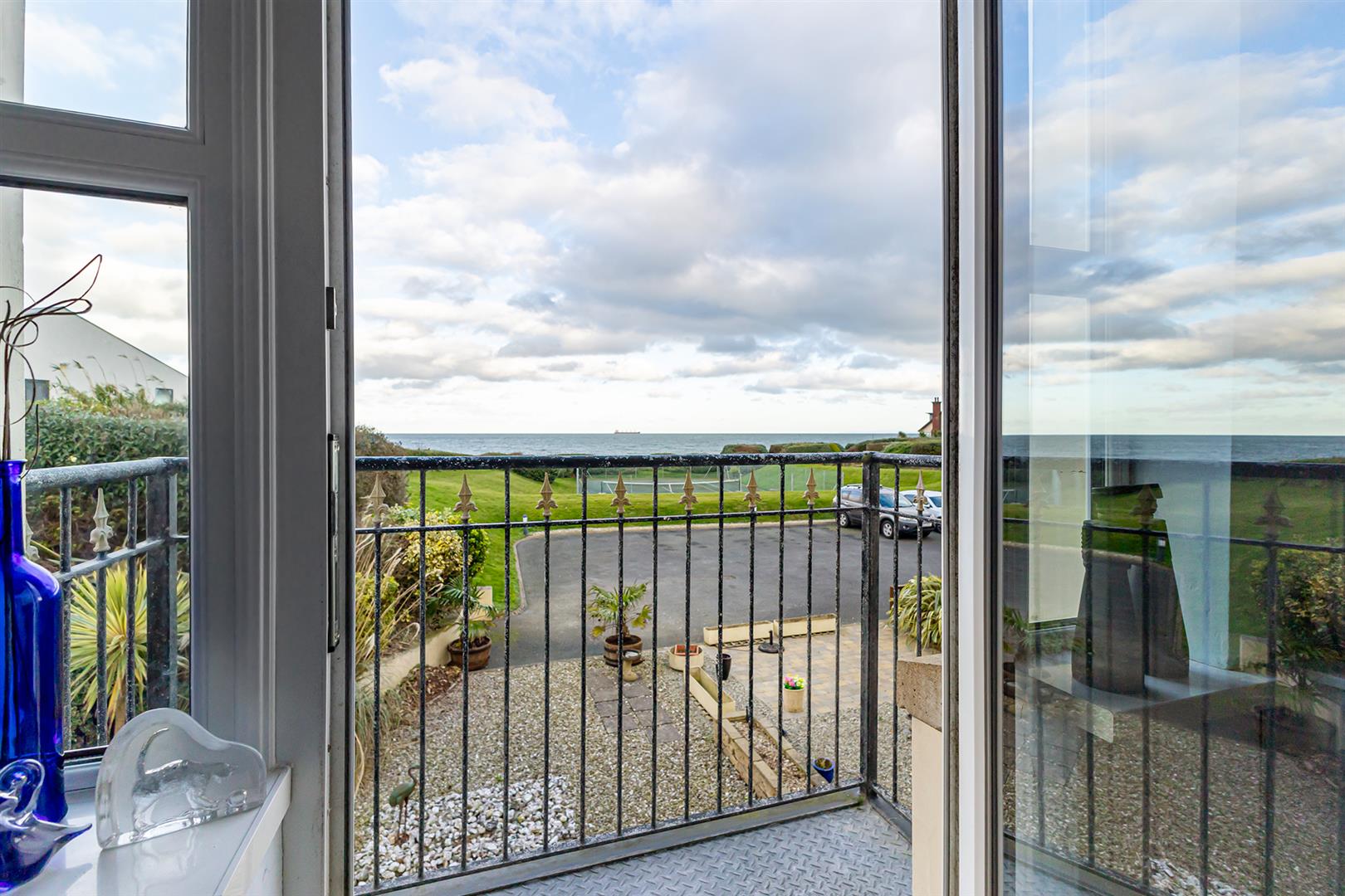 Picturesque views over the communal gardens, tennis court and beyond to Irish Sea. Privately owned balcony.