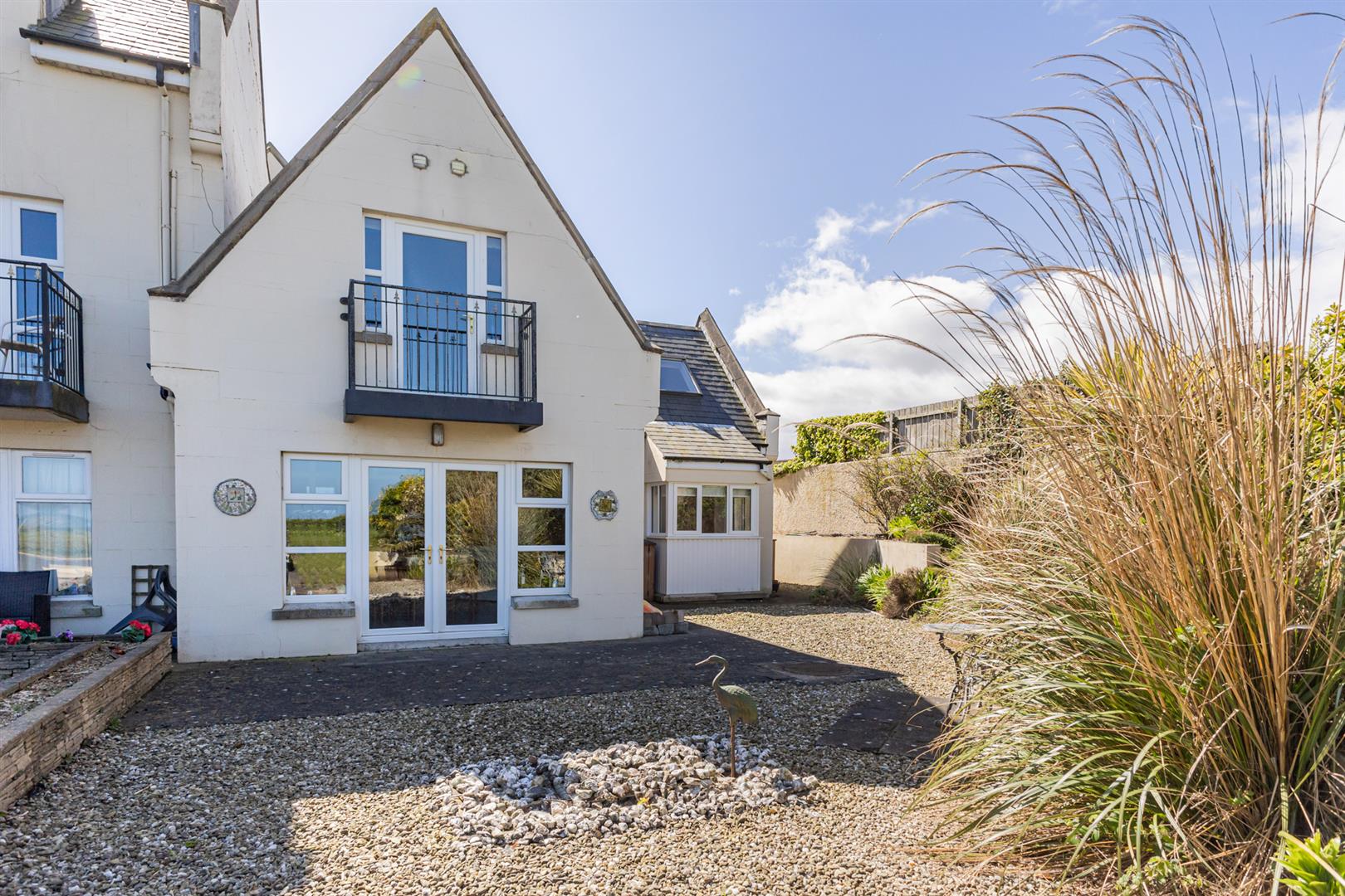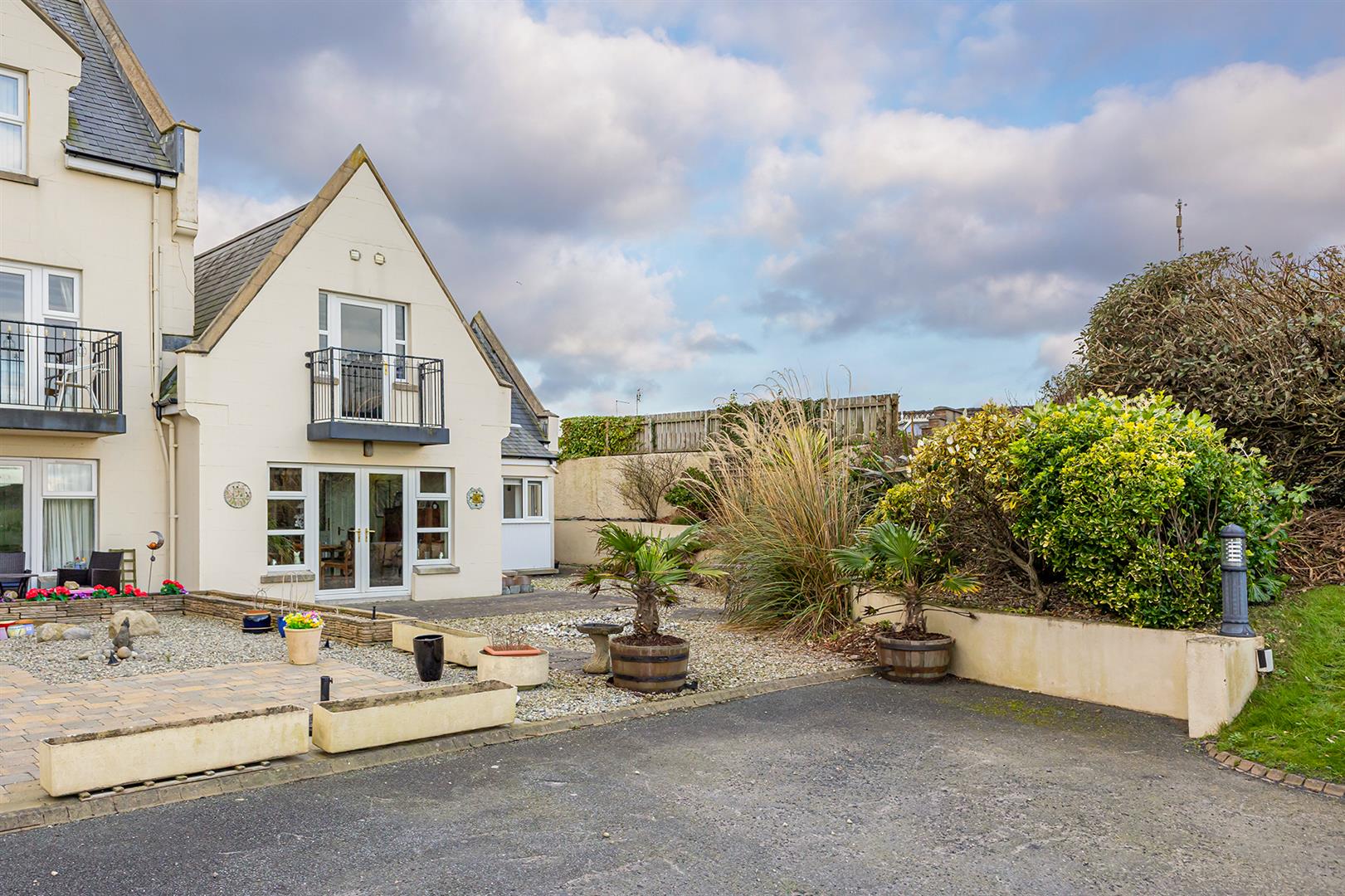 () - Two private allocated car parking spaces to the front, privately owned landscaped rear and side garden area with attractive brick paviour terrace, loose stones, planting with shrubs, picturesque views over the communal gardens to the Irish Sea, privately owned balcony accessed off the main bedroom.