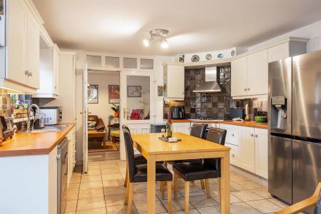 Range of high and low level units, laminate work surfaces, one and a half bowl single drainer stainless steel sink unit with mixer tap and water filter tap, integrated Bosch double oven, integrated Bosch five ring gas hob, tiled splashback, extractor fan above, plumbed for dishwasher, space for fridge freezer, fully tiled floor, part tiled walls.