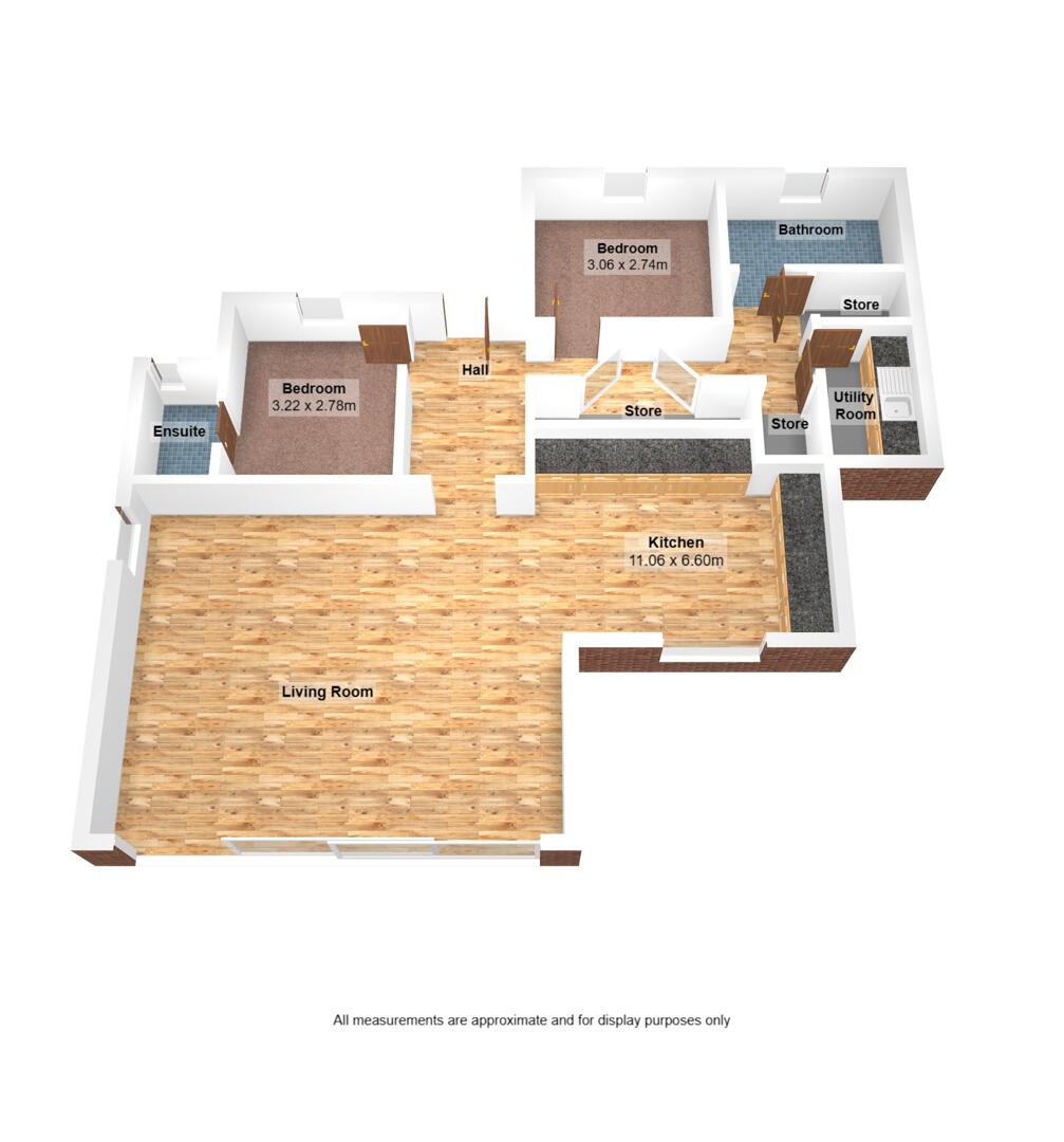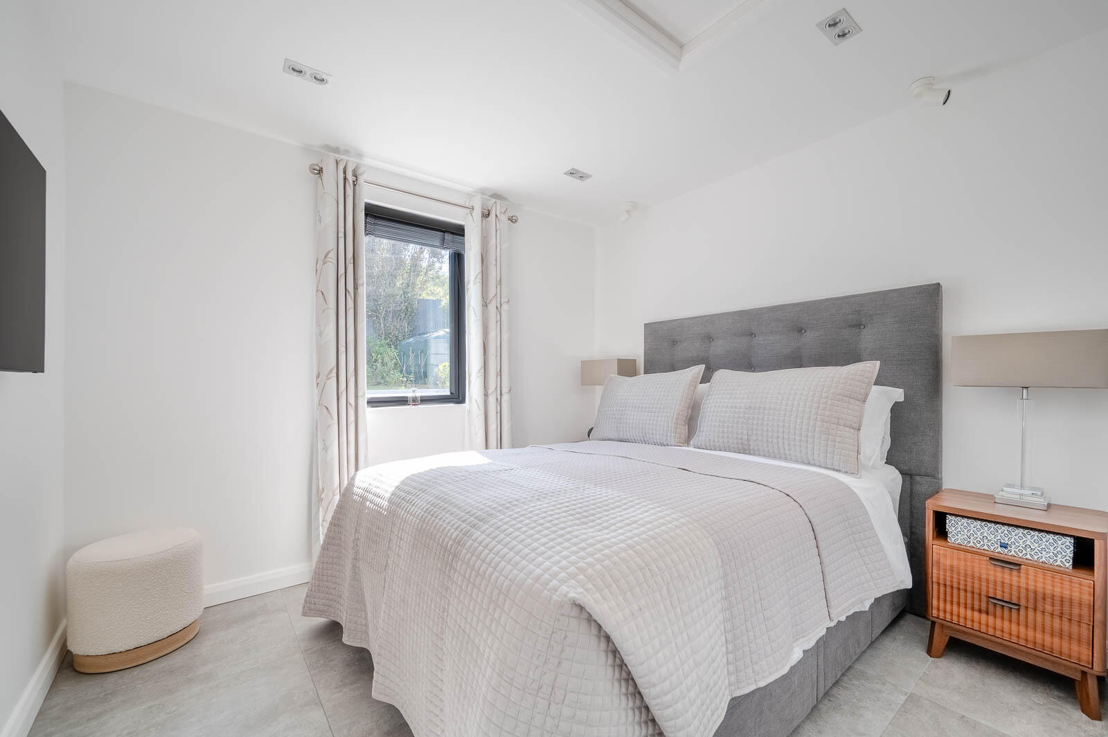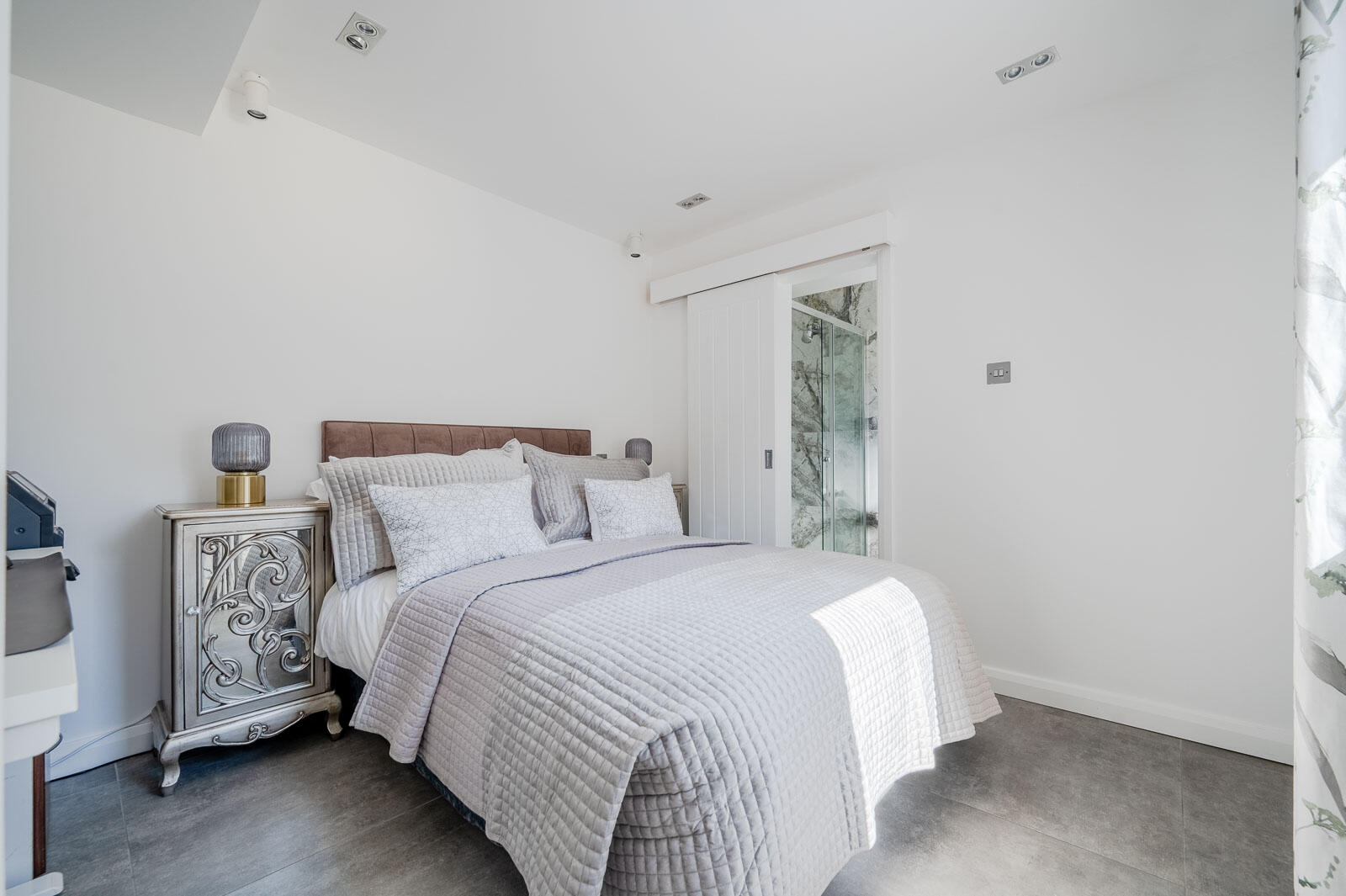 The master bedroom offers a luxurious retreat with a dedicated work space and a beautifully appointed en-suite featuring Villeroy & Boch sanitary-ware and premium brassware. A second bedroom overlooks the private rear gardens, while the main bathroom delivers a spa-like experience with high-end finishes, smart technology, and a deep soaking bath.