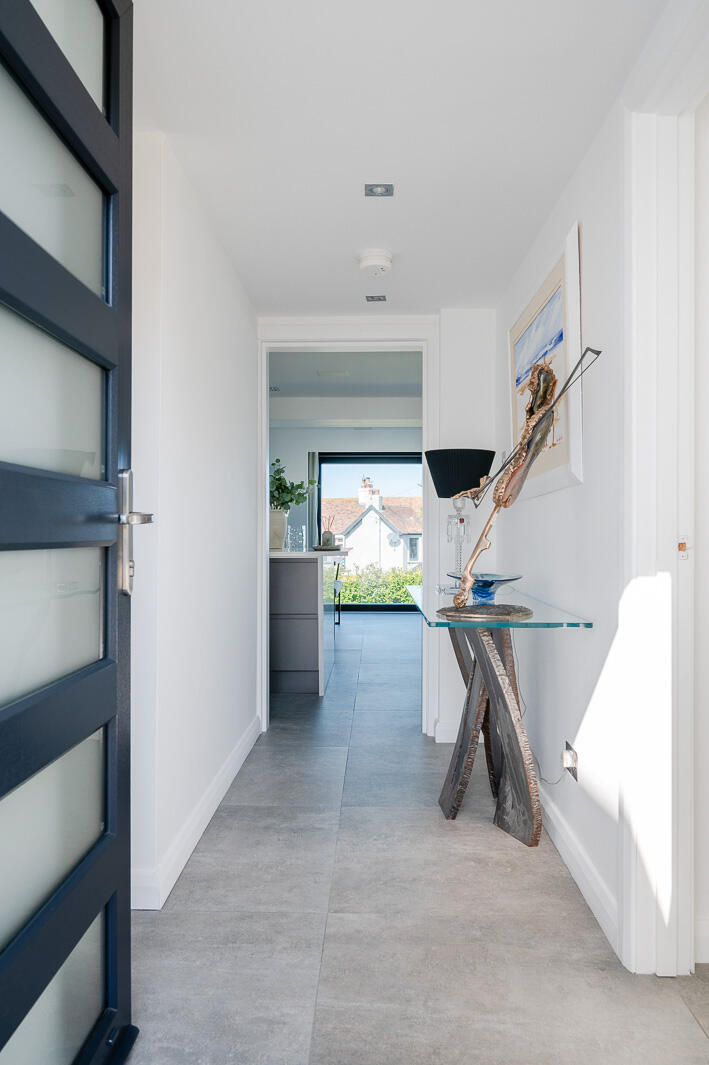 Reception Hall - Entry is gained via a custom composite opaque double-glazed door into a reception space defined by porcelain tiled flooring, with energy-efficient oil-fired underfloor heating running throughout. The hall features extensive integrated storage, including a generous walk-in closet, a further large walk-in storage space, and a linen press, fully shelved and housing the underfloor heating manifolds, all illuminated by recessed LED spotlighting.