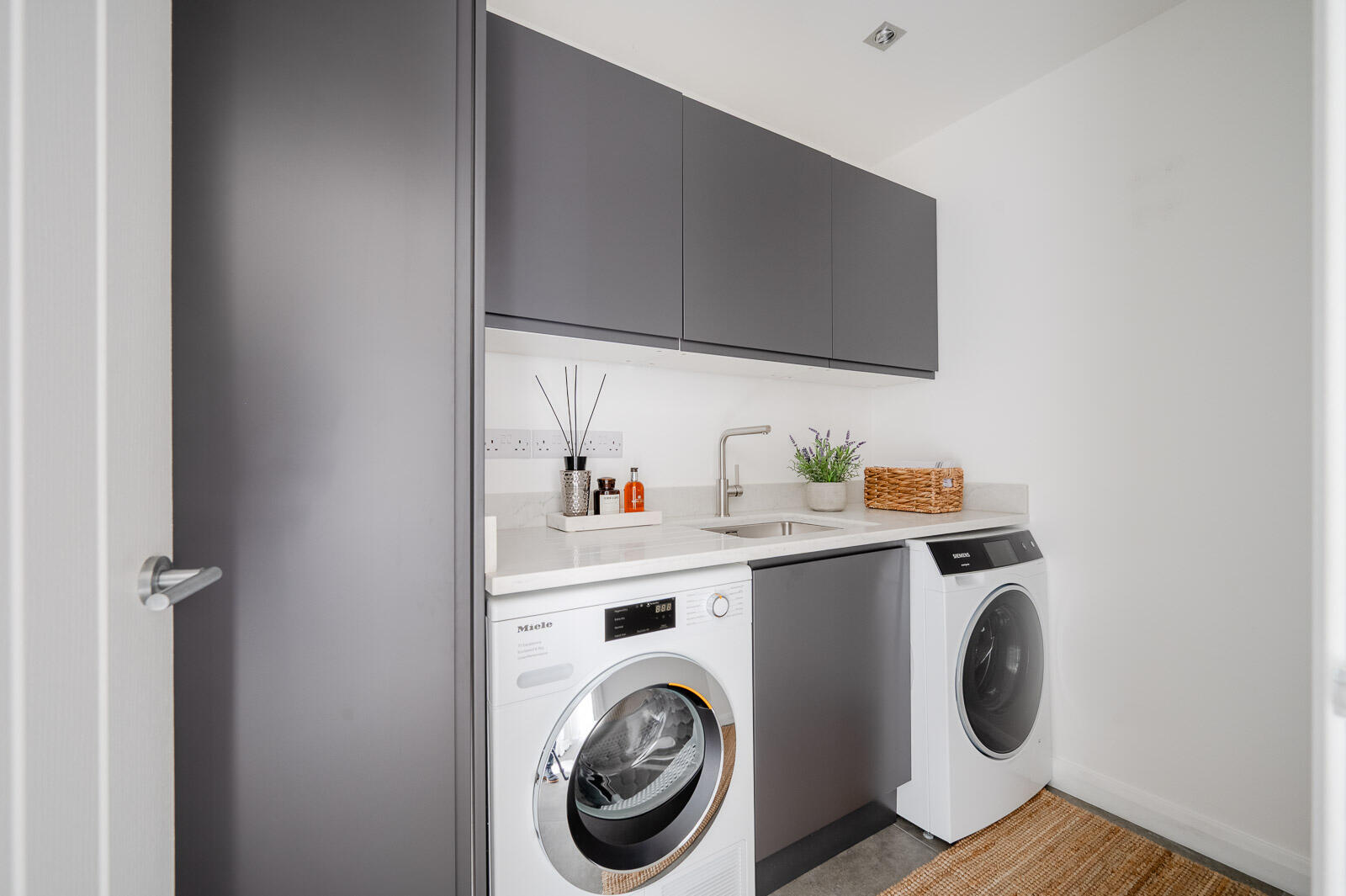 Utility Room - A dedicated utility room mirrors the kitchen's high specification, featuring Silestone worktops, bespoke cabinetry, and an integrated full-size larder freezer, along with space for a washing machine and separate tumble dryer.