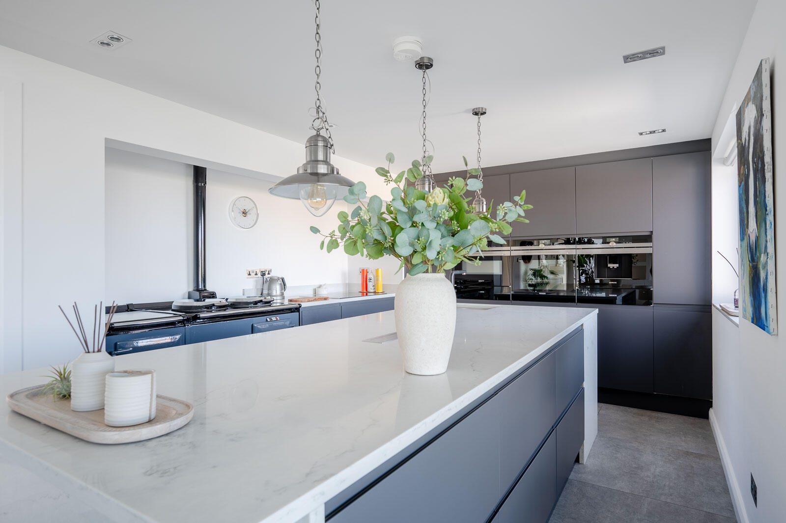 A four-oven, signature oil-fired Aga sits alongside a Siemens induction hob, while an oversized central island featuring the same Silestone with inset sink, integrated dishwasher, and matte black mixer tap provides a striking social focal point, complete with abundant deep storage drawers. A separate dining area sits seamlessly between the kitchen and living space.