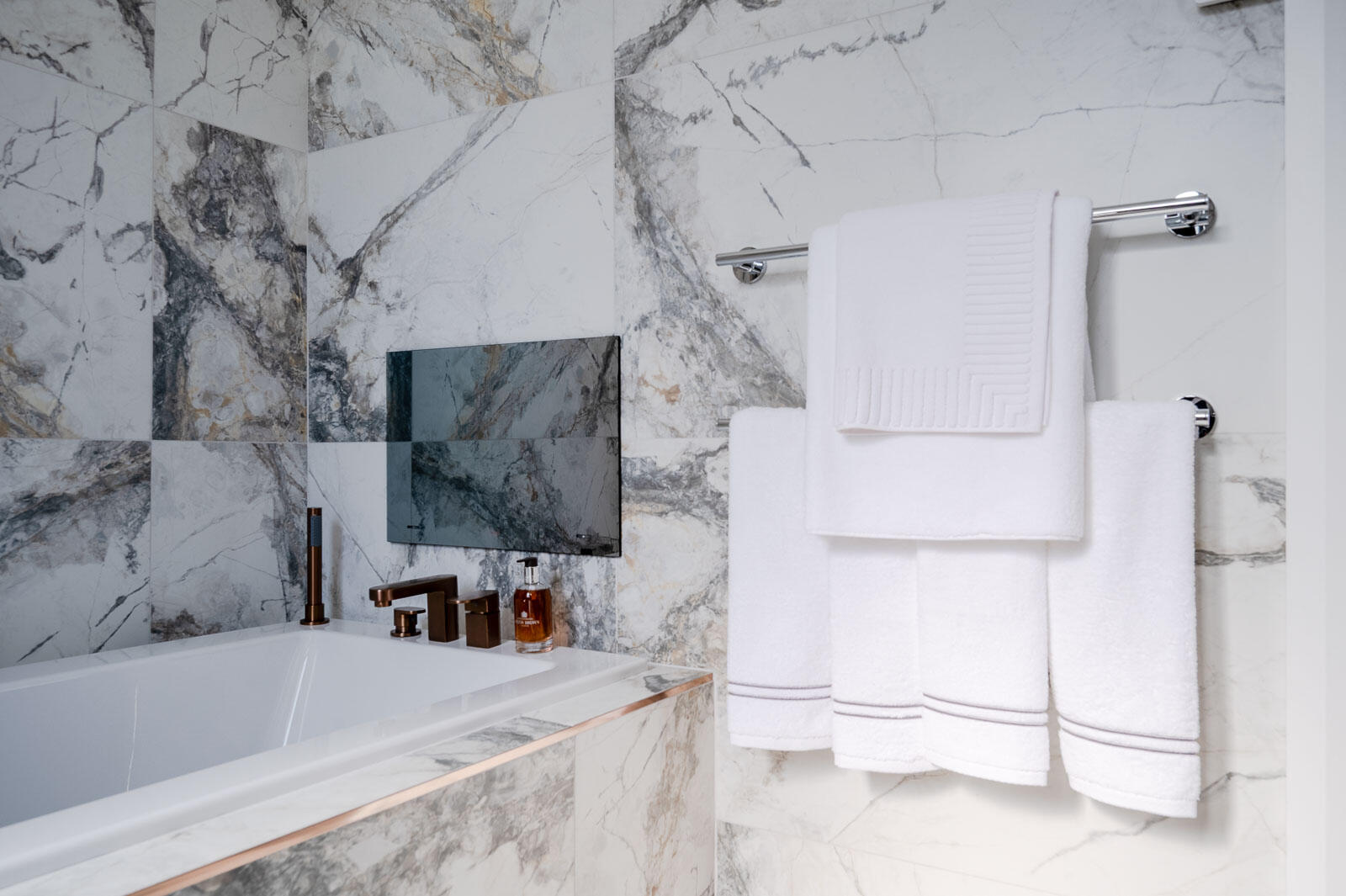 Rose gold brassware and trim elevate the space, alongside a built-in Bluetooth ceiling speaker system, illuminated recessed shelving, and a wall-recessed television-delivering a truly luxurious bathing experience.