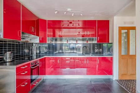 With range of high and low level high gloss units, laminate work surfaces, single bowl single drainer stainless steel sink unit with mixer tap, integrated oven, integrated four ring hob, tiled splashback, extractor fan above, integrated fridge, tiled floor in kitchen area.