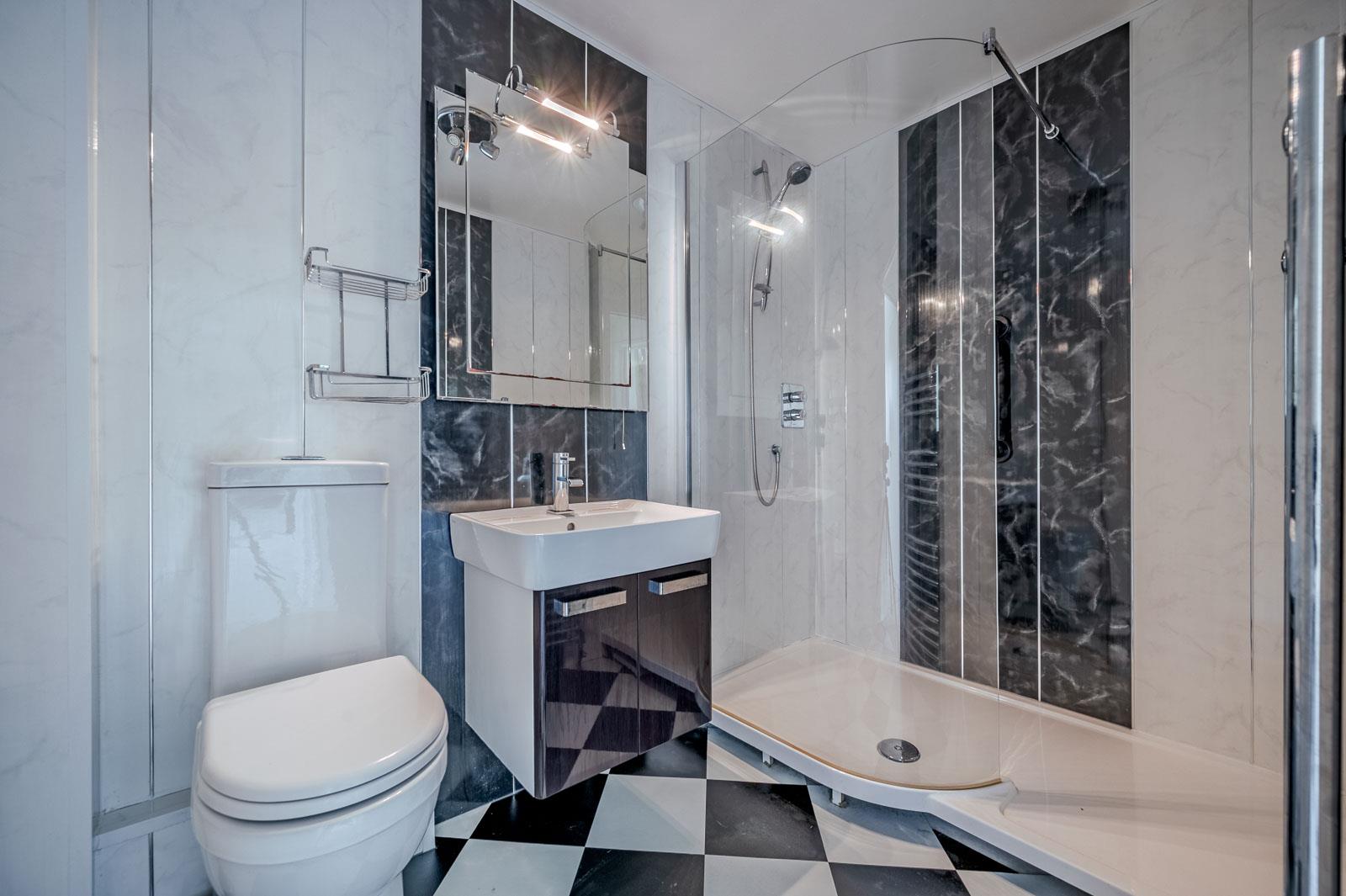 Shower Room: - () - Three piece suite comprising shower cubicle, wash hand basin with mixer tap, storage beneath, low flush WC, chrome heated towel rail, extractor fan.