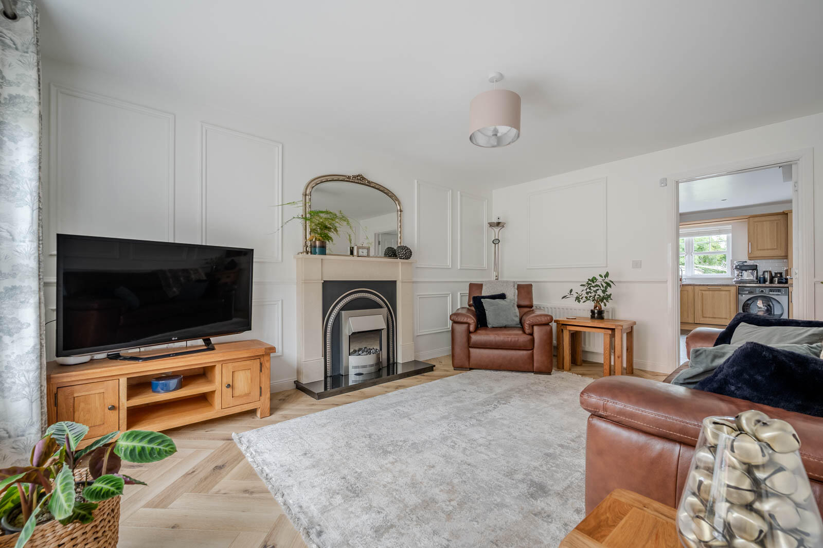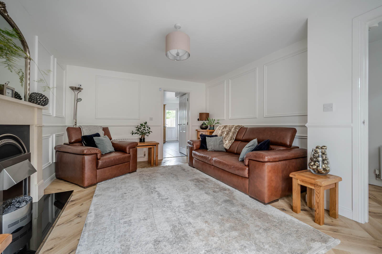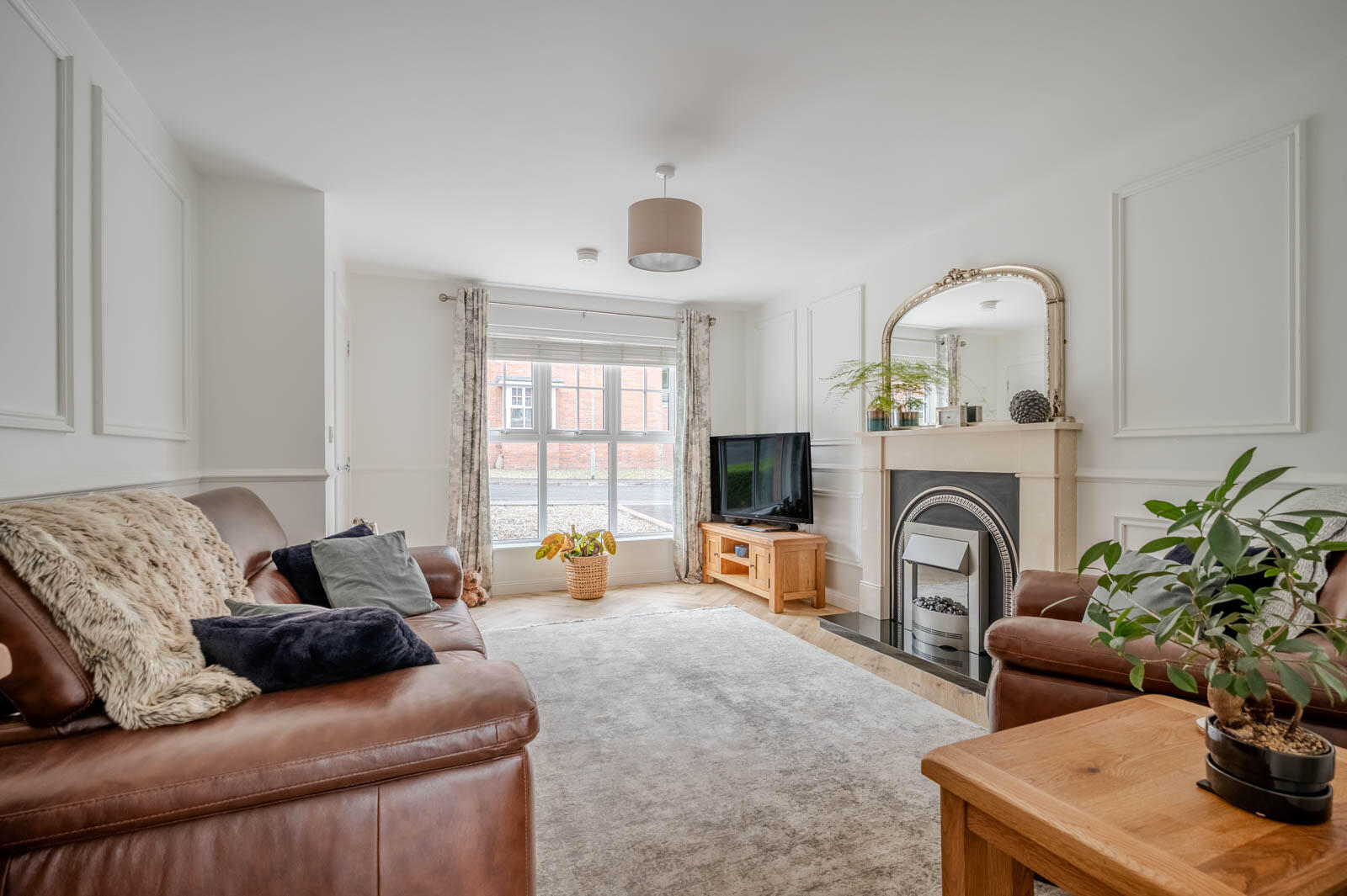 4.83m x 3.66m (15'10 x 12'0) - With oak laminate herringbone wooden flooring and feature wood panelling to walls, Italian marble fireplace with cast iron and polished inset, granite hearth and electric fire, mature outlook to front.