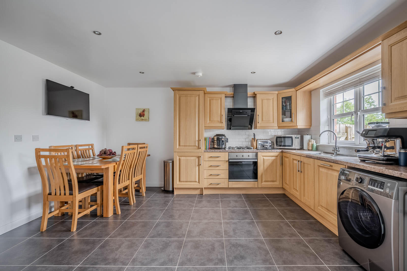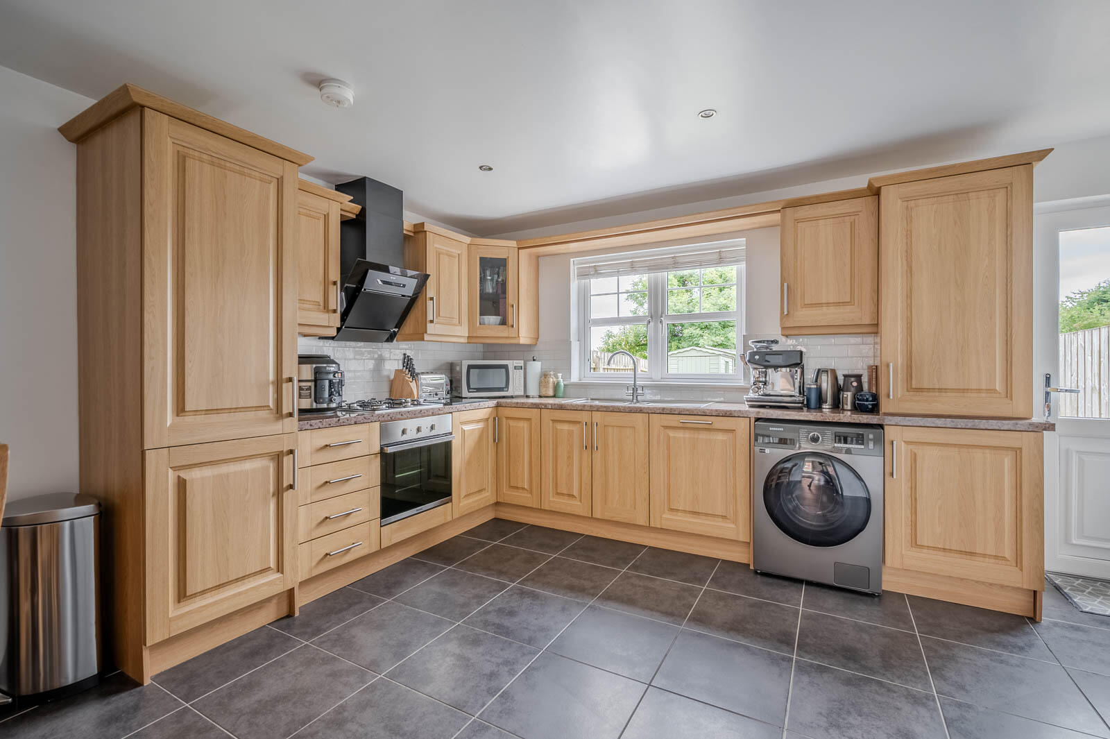 4.78m x 4.65m (15'8 x 15'3) - Bespoke fitted oak kitchen with stainless steel fittings, granite effect work surface, single drainer sink and a half stainless steel sink unit, chrome mixer taps, concealed Ferroli gas fired boiler, regularly serviced, plumbed for washing machine, integrated Neff dishwasher, integrated stainless steel four ring gas hob and stainless steel Baumatic oven below, extractor hood above, integrated fridge freezer, ceramic tiled floor, built-in glazed display cabinet, mature outlook to easily maintained rear gardens, recessed LED spotlighting, ample dining and living space with uPVC double glazed access door to rear garden.