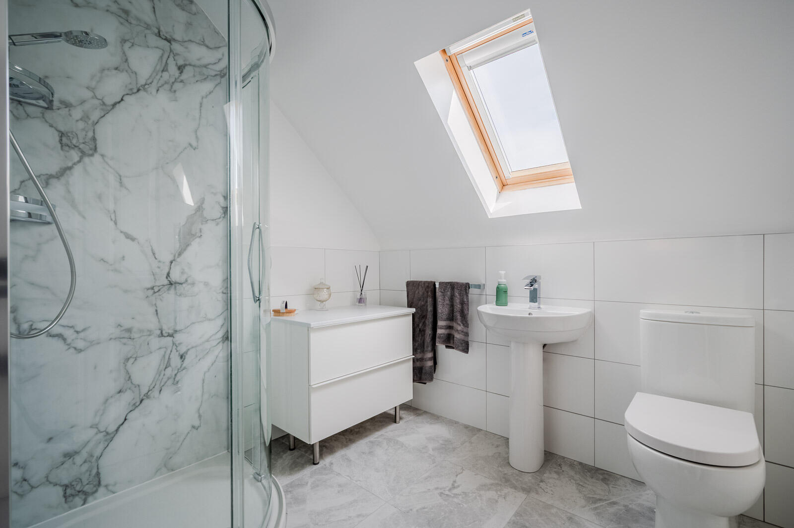 2.36m x 2.06m (7'9 x 6'9) - With contemporary white suite comprising low flush WC, pedestal wash hand basin, chrome mixer taps, built-in uPVC panelled shower cubicle with thermostatically controlled shower unit, overhead drencher and shower attachment, ceramic tiled floor, part porcelain tiled walls, Velux window and fitted blind, chrome heated towel rail.