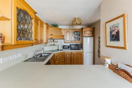 () - Kitchen with range of high and low level units, laminate work surfaces, single bowl single drainer stainless steel sink unit with mixer tap, integrated four ring hob, integrated washing machine, extractor fan, recess for fridge freezer, glass display cabinets, fully tiled floor in kitchen area, part tiled walls, views of Ballyholme Bay from kitchen.