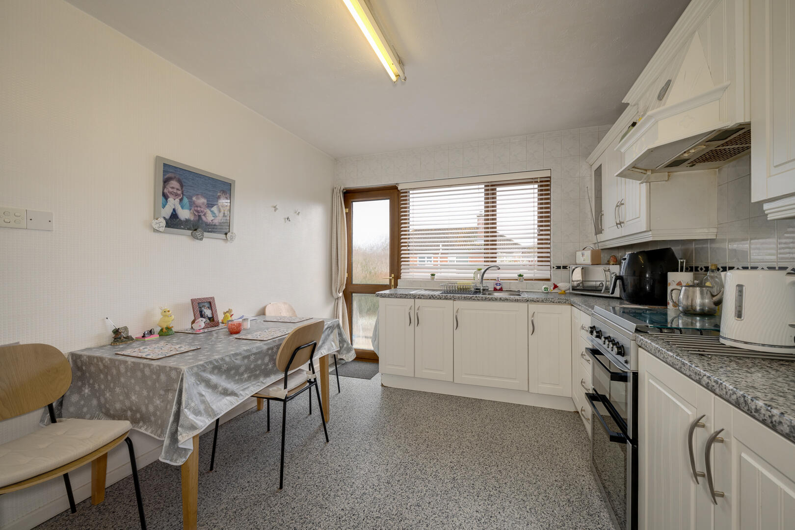3.94m x 3.02m (12'11 x 9'11) - Modern fully fitted kitchen with range of high and low level units, stainless steel fittings, granite effect work surface, single drainer sink and a half stainless steel sink unit, mixer taps, piped for gas cooker, fixed canopy extractor hood, space for fridge freezer, ample dining area and oak uPVC double glazed access door to rear patio and garden, outlook to rear garden.