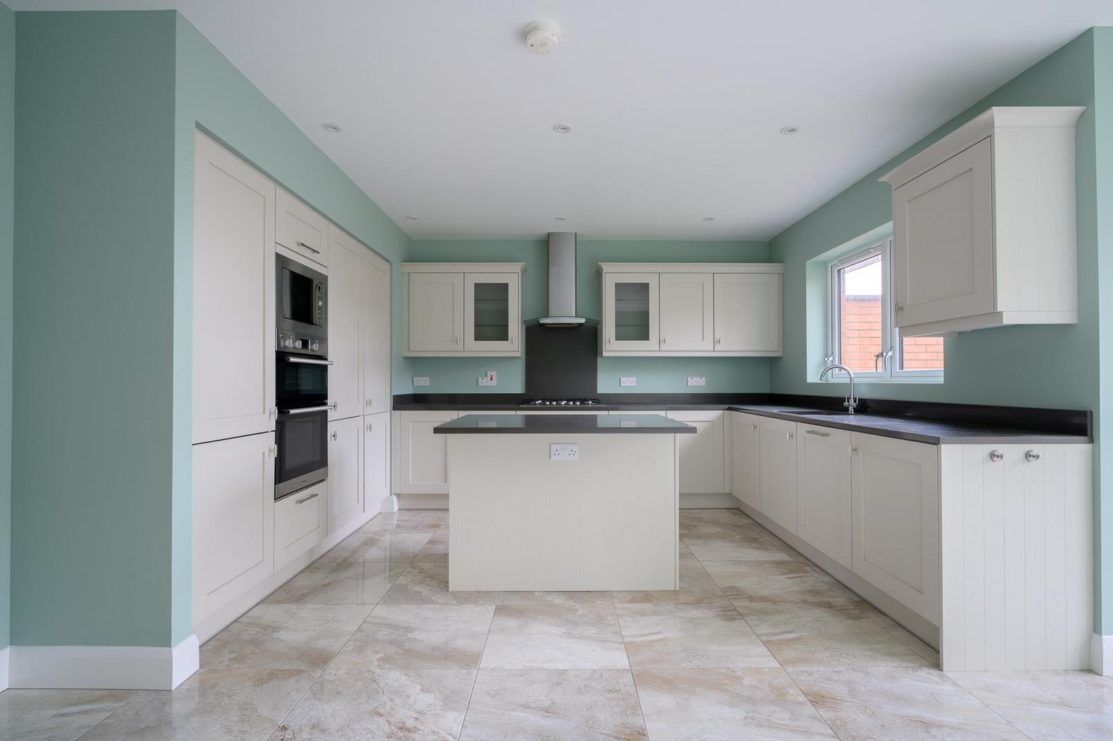 (5.64m x 5.46m) - Bespoke fitted kitchen with range of high and low level units, integrated dual oven, integrated microwave, integrated fridge, integrated freezer, integrated dishwasher, integrated washer dryer, granite work surface, stainless steel Blanco sink, chrome mixer taps, outlook to rear garden, marble tiled floor, island unit, granite worktop, concealed cupboard for power and electrics, square bay with uPVC and double glazed patio doors to rear garden.