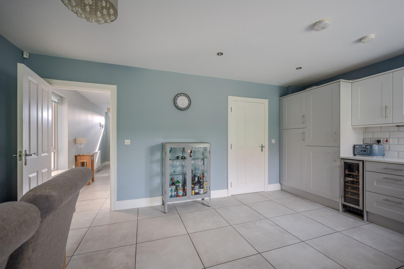 5.23m x 3.89m (17'2 x 12'9) - With range of high and low level units, concealed Worcester gas fired boiler, integrated fridge, integrated freezer, integrated wine fridge, integrated oven, four ring hob, stainless steel and glazed extractor above, subway tiled walls, partial, galaxy granite effect work surface, integrated dishwasher, additional integrated oven, inset spotlights, tiled floor, utility space, square arch leading through to family room.