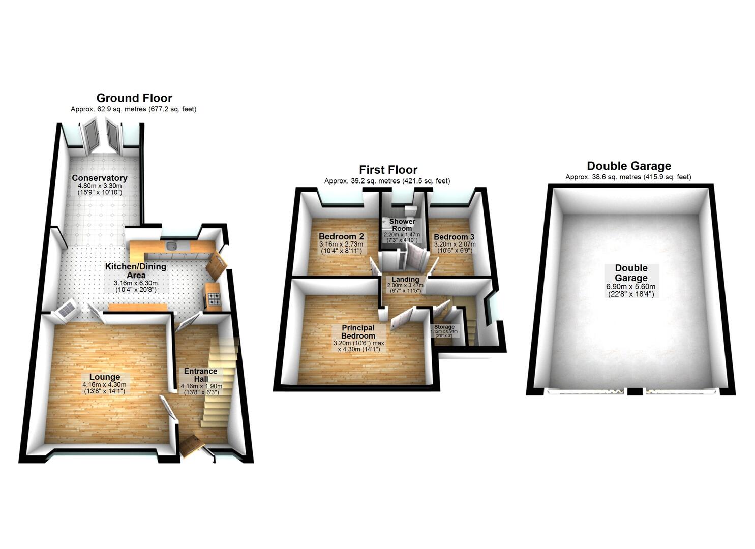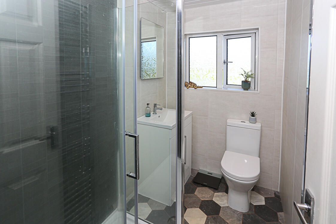 2.21m x 1.47m (7'3 x 4'10) - Comprising of white suite with low flush WC. Wall hung wash hand basin with chrome mixer tap. Thermostatically controlled shower with telephone handle attachment and drencher above, sliding shower door. uPVC panelled walls. Tongue and groove ceiling. Ceramic tiled floor.