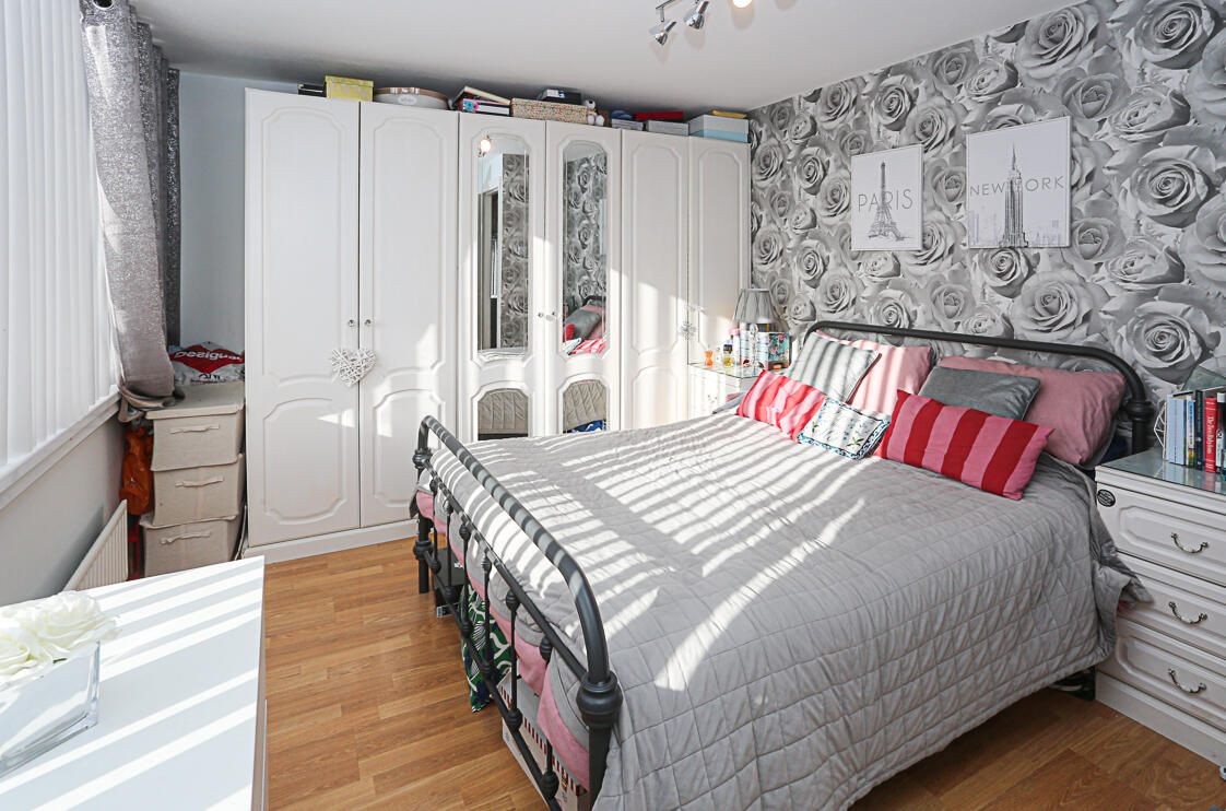 4.29m x 3.20m (14'1 x 10'6) - With laminate wood effect floor. Built-in storage cupboard and aspect to front.