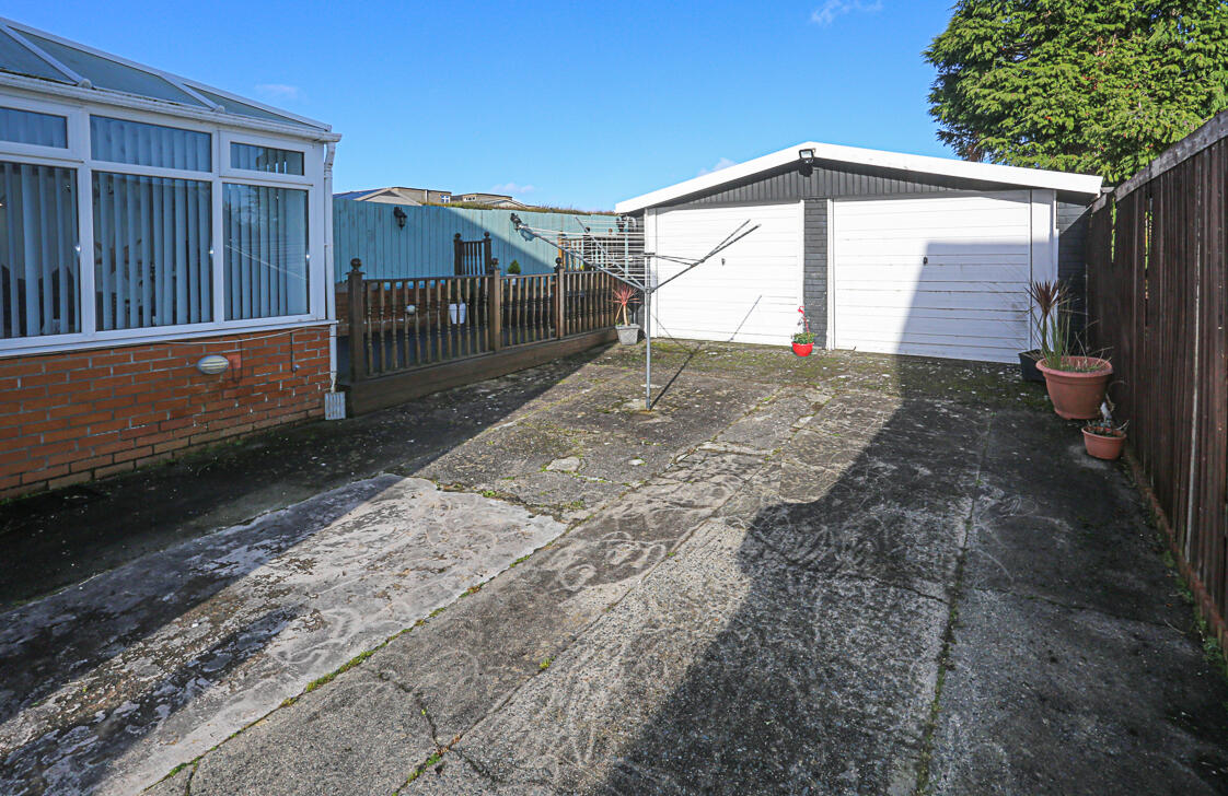 Fully enclosed rear garden. Two-tiered decked area. Outside lighting. Outside tap. Outside light.