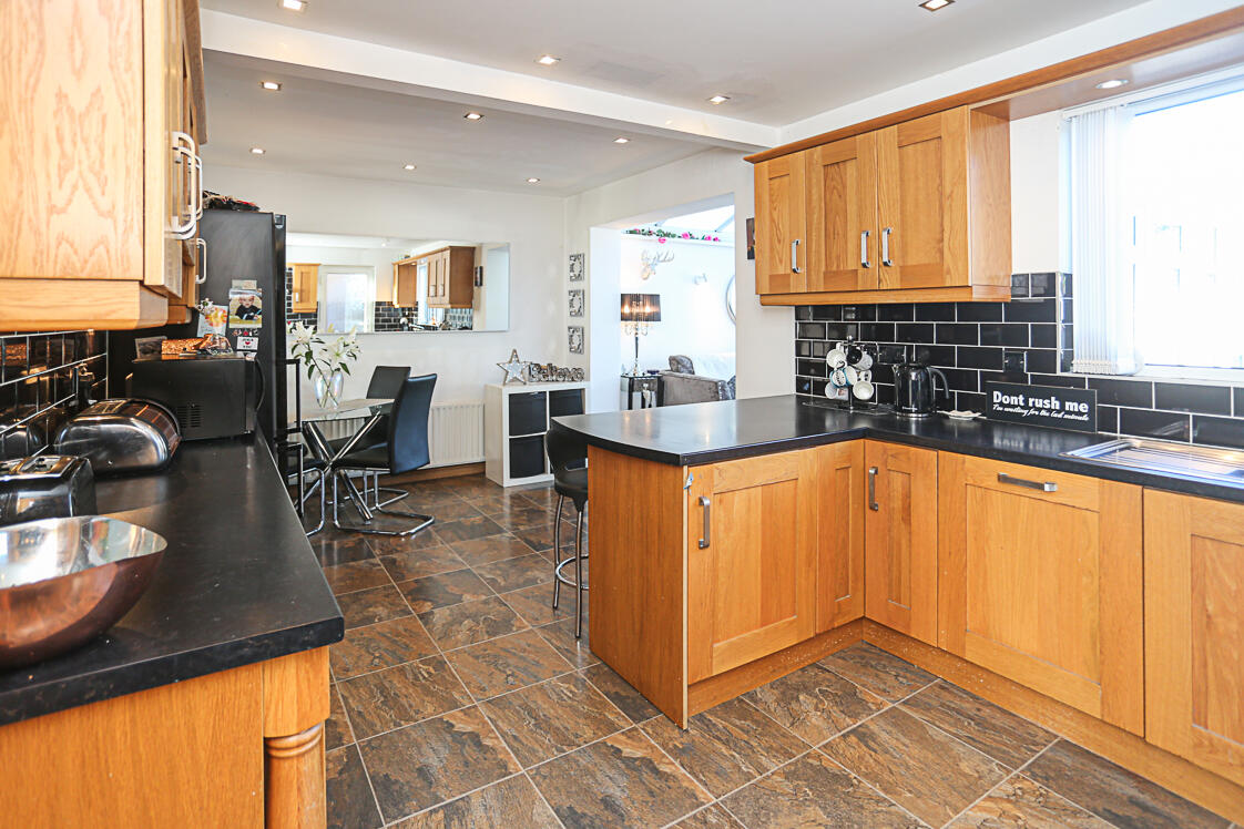 6.25m x 3.15m (20'6 x 10'4) - Kitchen with range of high and low level oak effect units. Laminate work surface. Single drainer sink and a half with mixer taps. Plumbed for washing machine, Integrated dishwasher. Integrated under bench fridge. Glazed display cabinets. Part tiled walls. Under double Hotpoint oven, four ring Hotpoint ceramic hob, stainless steel extractor above. Double glazed door to garden. Breakfast bar area. Tile effect floor and square arch leading through to sun room.