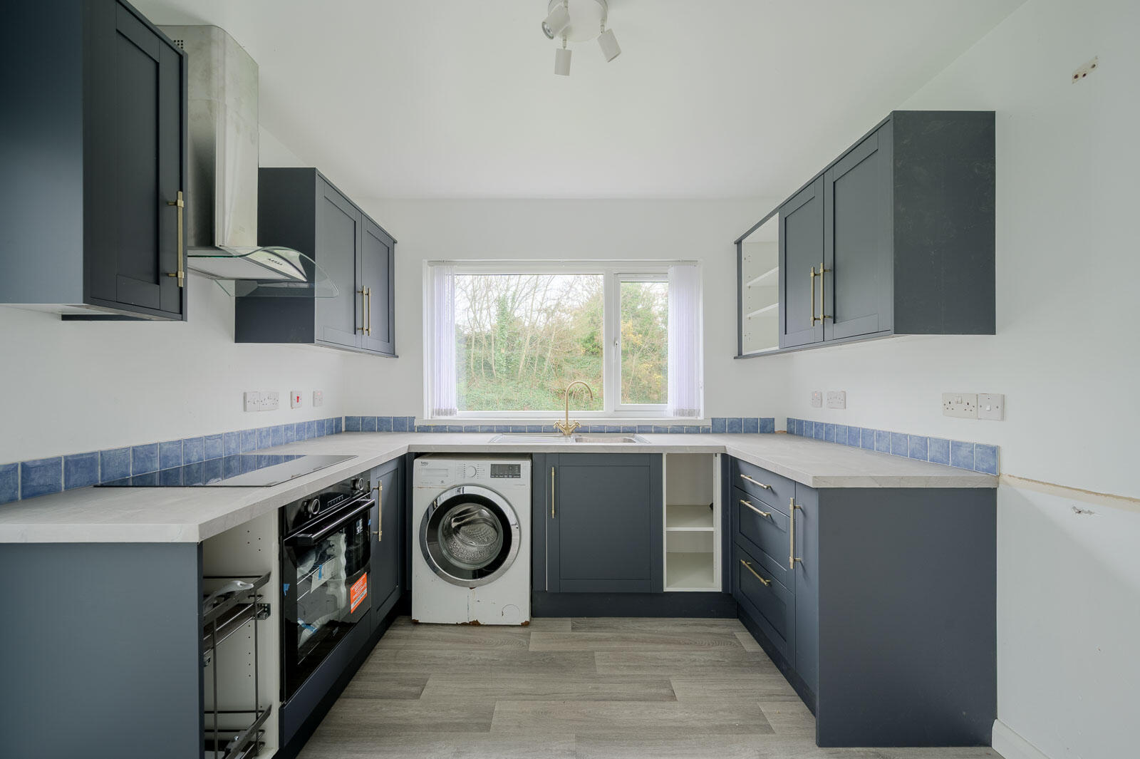 2.90m x 2.87m (9'6 x 9'5) - Range of high and low level units, space for washing machine, space for under counter fridge, integrated oven, four ring hob, extractor above, outlook to rear.