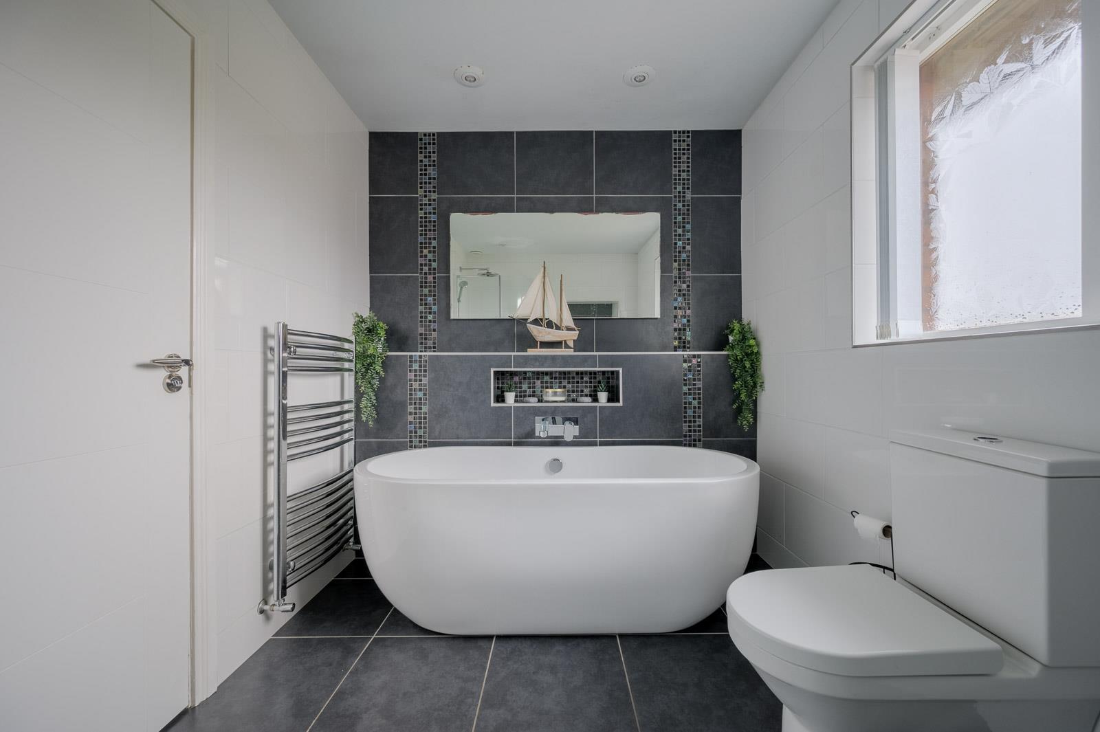 2.15 x 2.99 (7'0" x 9'9") - Marble and white suite comprising low flush WC, floating vanity unit, chrome mixer taps, drawer unit below, illuminated mirror above, built-in fully tiled shower cubicle, chrome thermostatically controlled shower unit, overhead drencher and telephone hand shower, feature free standing kidney-shaped deep fill bath with wall mounted mixer taps, fully tiled walls with contrasting tiling detail, product shelf and recessed mirror, recessed spotlighting, extractor fan.