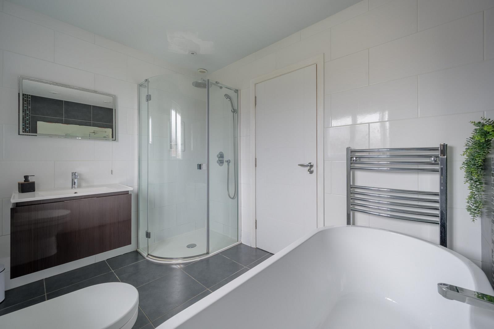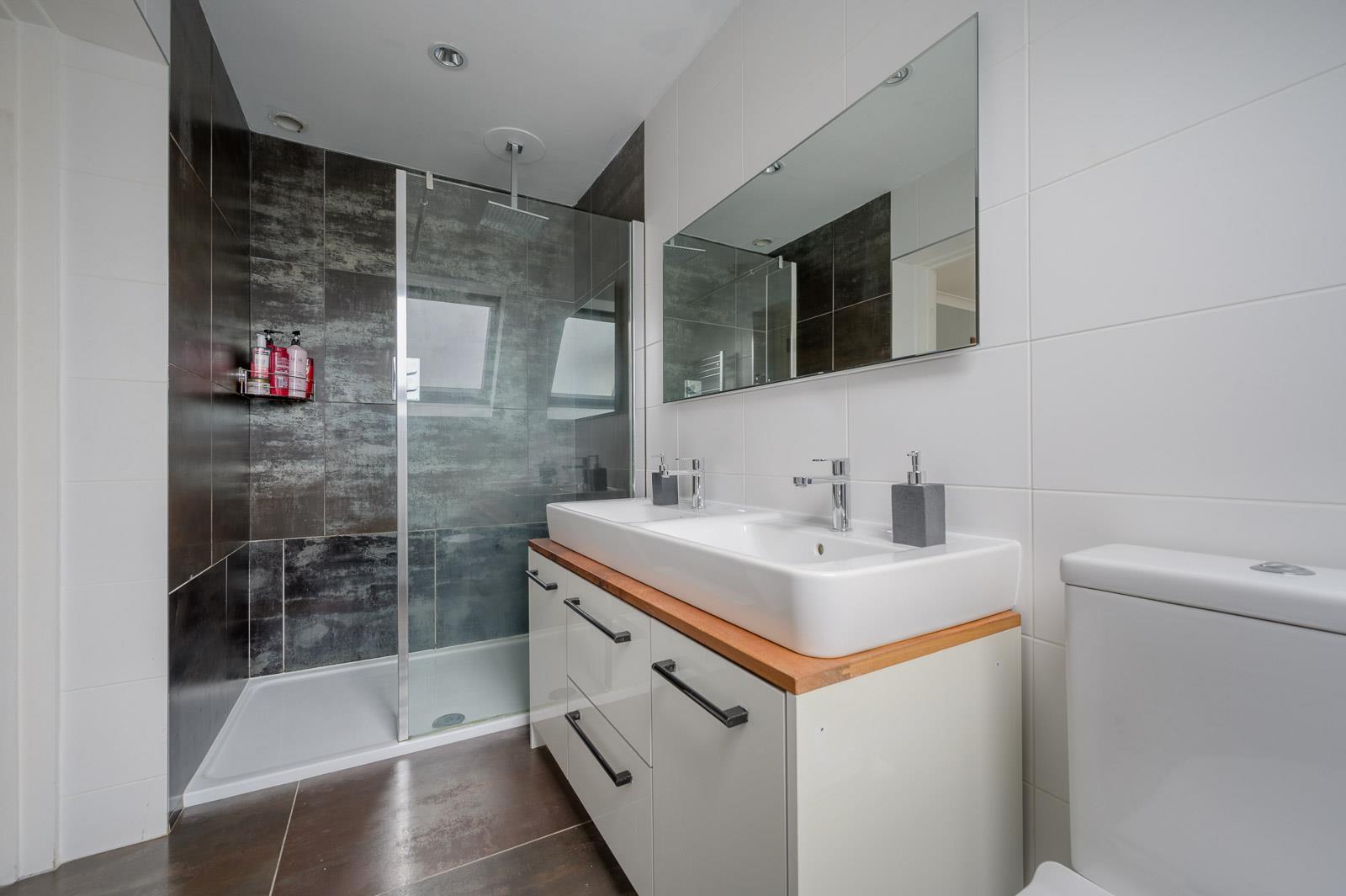 With modern white suite comprising low flush WC, twin ceramic sink unit, chrome mixer taps, mirror above, cabinets below, double built-in fully tiled shower cubicle with chrome thermostatically controlled shower unit, overhead rain shower and recessed spotlighting, chrome heated towel rail, Velux window, fully tiled walls with contrasting tiling detail, porcelain tiled floor.