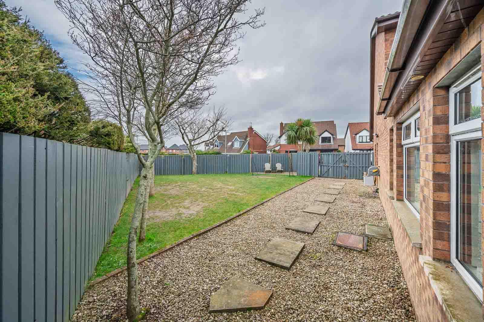 Enclosed storage area to side, rear gardens laid in loose pebbles, paved patio and lawns, barked flowerbeds and raised barked flowerbeds, mature shrubs and planting, excellent degree of privacy, southerly aspect, outdoor lighting, water tap, large side garden laid in lawns, mature shrubs, mature planting, loose pebbled patio areas, double gates providing secure parking in loose pebbled area for boat, caravan, etc.