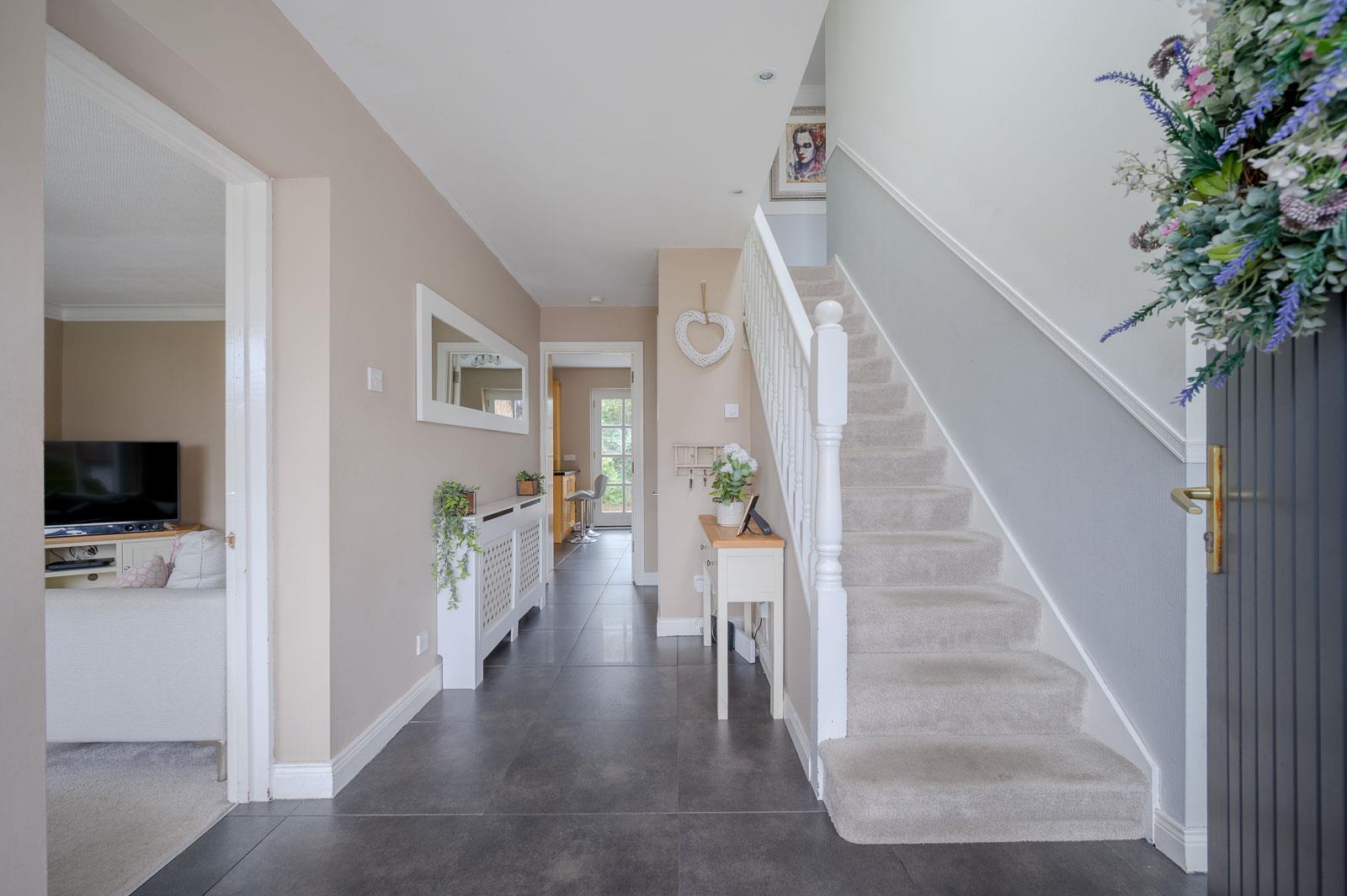 With double height ceiling, recessed LED spotlighting, ceramic tiled floor, walk-in storage and cloaks cupboard under stairs.