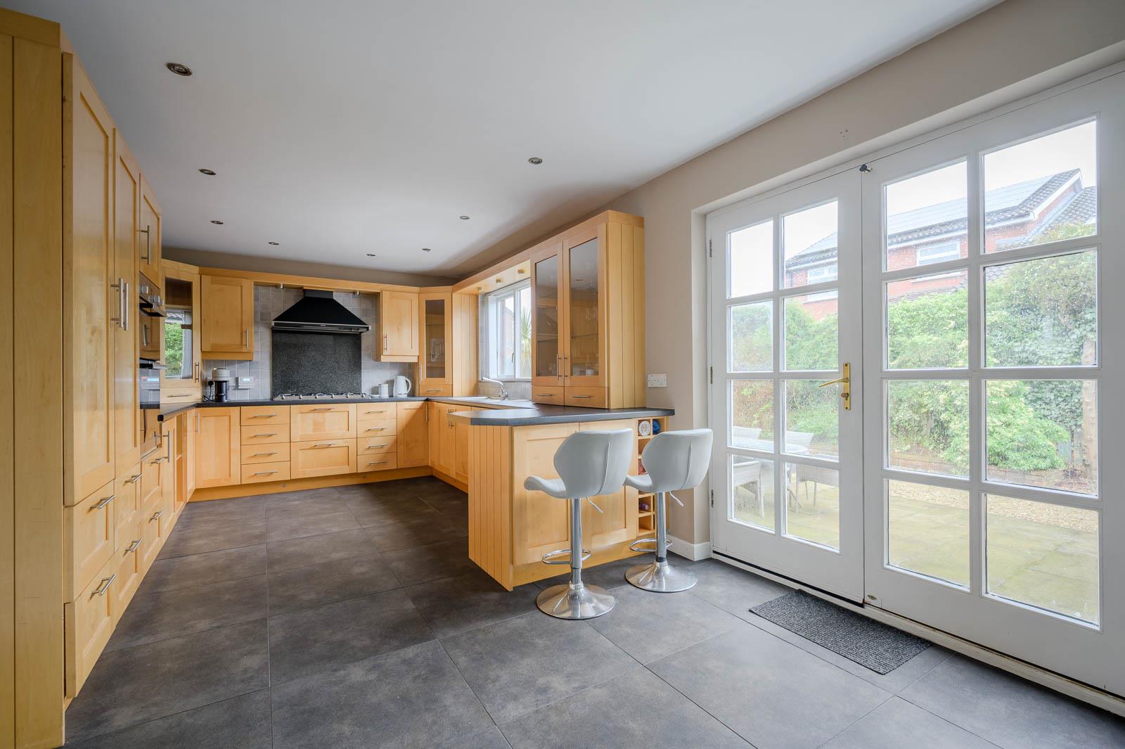 3.25m x 6.53m (10'8" x 21'5") - With ceramic tiled floor, kitchen opens through square arch to dining and sun room, bespoke fitted maple Shaker kitchen, stainless steel fittings, granite effect work surface, integrated stainless steel Smeg five ring gas hob, granite splashback, extractor hood above, built-in glazed display cabinets, integrated stainless steel microwave, integrated stainless steel high level double ovens, built-in pantry, pull-out drawers, integrated dishwasher, stainless steel sink and a half sink unit, mature outlook to south facing rear garden, peninsula unit with built-in casual dining, open space for dining or living with double glazed French doors opening to rear patio and south facing rear garden, open through square arch to dining space and open to garden room/sun room.