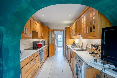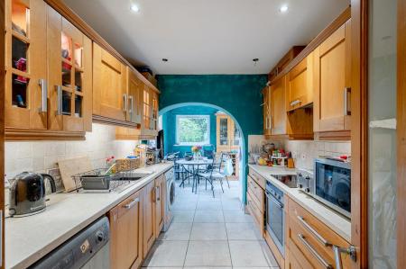 Range of high and low level solid oak units, granite effect work surfaces, Franke single bowl single drainer stainless steel sink unit with mixer tap, integrated Neff oven, integrated four ring hob, tiled splashback, extractor fan above, integrated dishwasher, plumbed for washing machine, space for tumble dryer, integrated fridge freezer, fully tiled floor, part tiled walls, casual dining area with double glazed sliding patio door to rear garden.