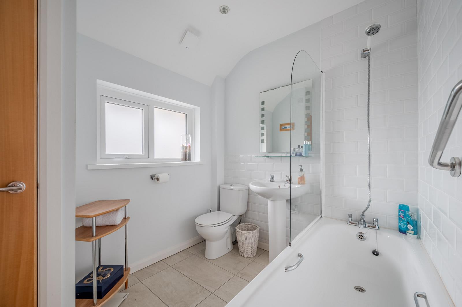 Three-piece white suite comprising: paneled bath with mixer tap and hand shower, low flush WC, wash hand basin with chrome mixer tap in vanity unit, chrome heated towel rail, fully tiled floor, fully tiled walls, extractor fan.