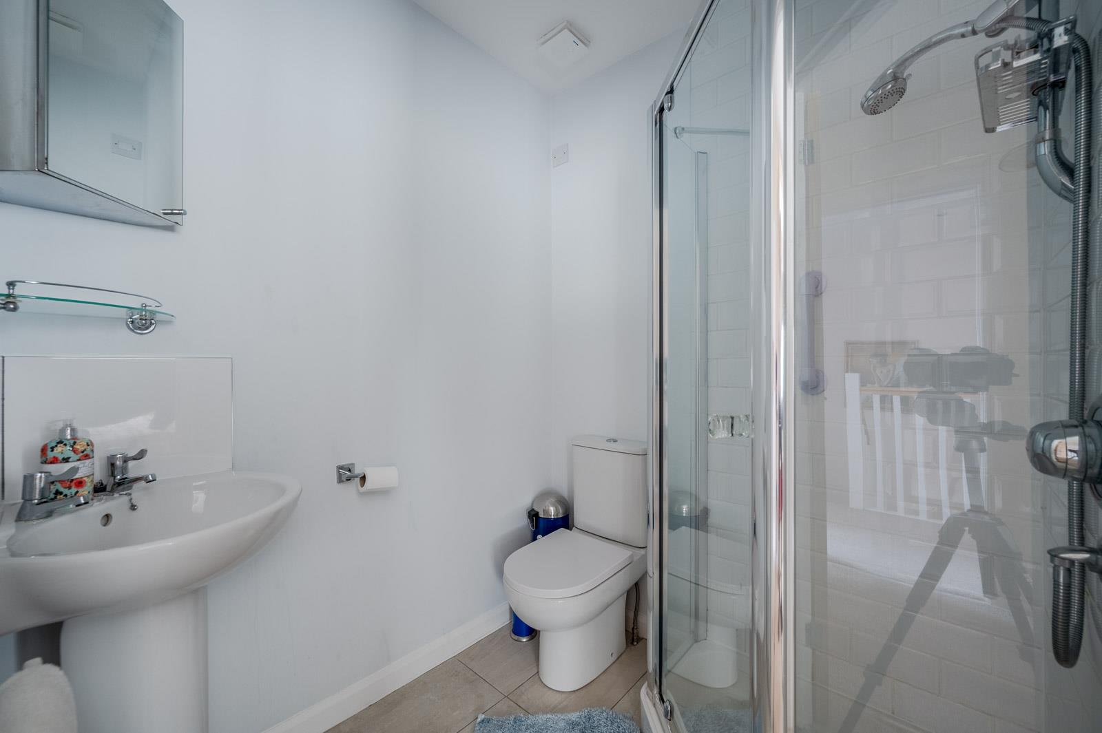 White suite comprising low flush WC, wash hand basin with mixer tap, tiled splash back, vanity unit, plumbed for washing machine, laminate oak floor, Worcester Bosch gas fired boiler, extractor fan.