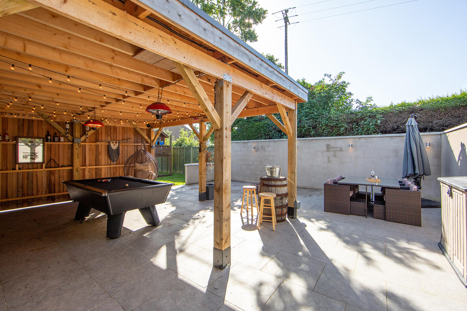 With lights, electric and gas firepit, in an attractive tiled floor area, excellent space for outdoor entertaining. Gas storage for the firepit hidden in a separate storage area. Cedar-clad walls.