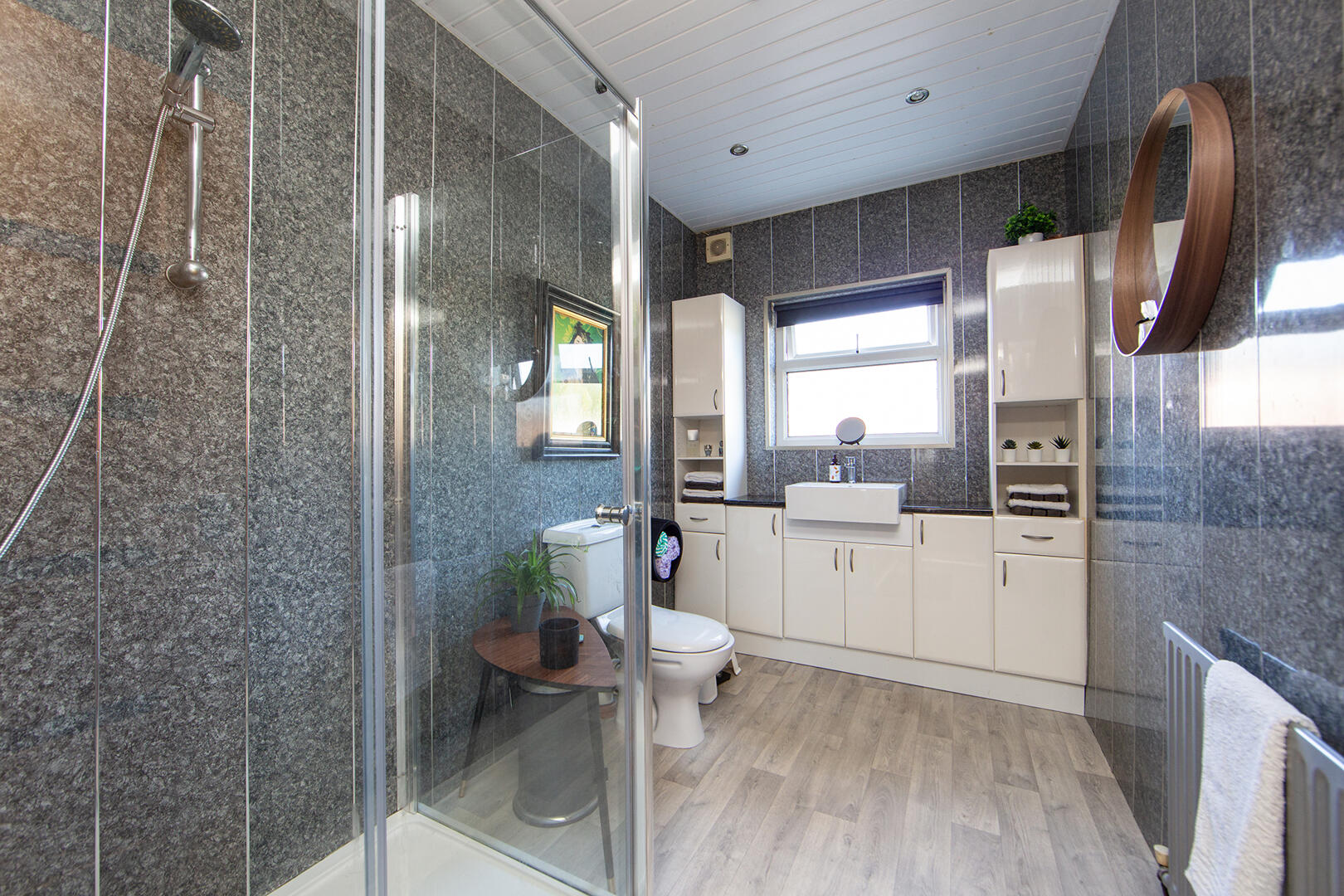 Four piece white suite comprising: tiled panelled bath, separate walk-in wet room style shower with hand shower, low flush WC, wash hand basin with mixer tap and storage beneath, storage area, chrome heated towel rail, fully tiled floor, fully tiled walls, extractor fan and built-in television. Doored access to gas boiler.