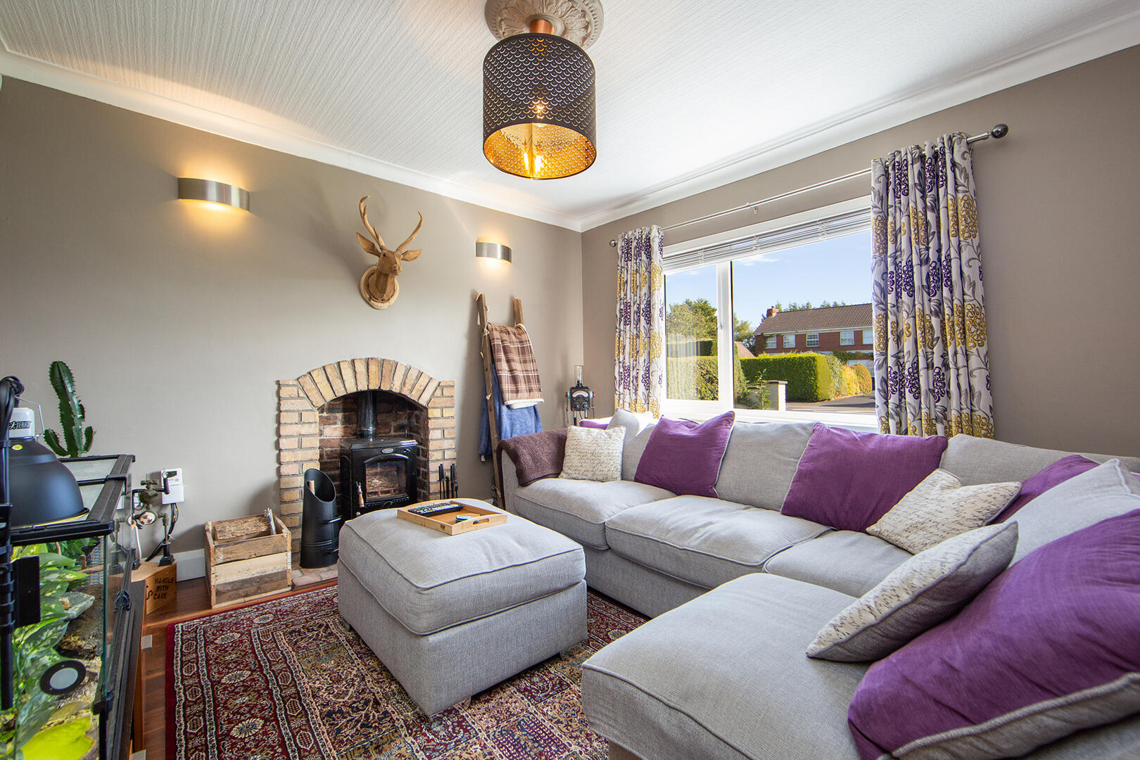 Solid wooden floor, cast iron Horse Flame wood burning stove with brick recess and brick hearth, cornice ceiling.