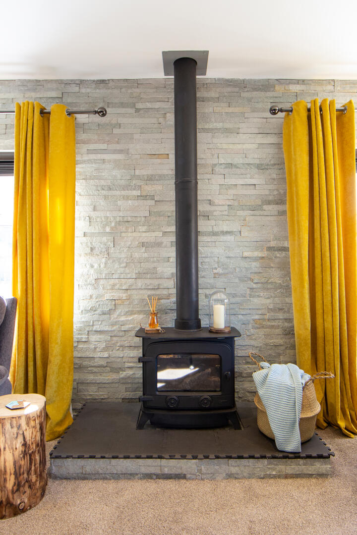 Cast iron gas stove on slate display, feature slate wall.