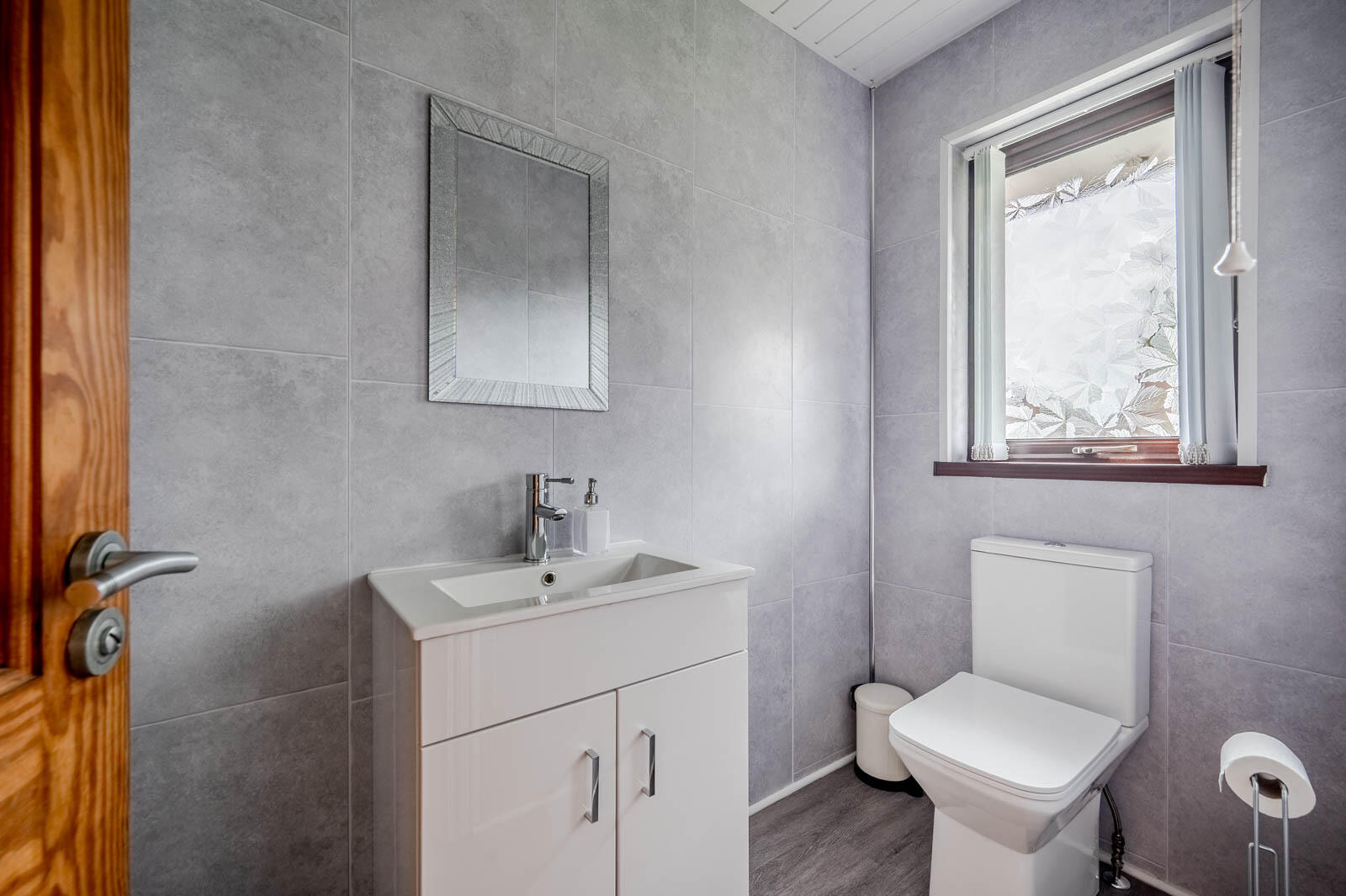 Four Piece Suite Comprising Panelled Bath With Hand Shower, Separate Built-in Shower Cubicle, Floating Wash Hand Basin, Low Flush Wc, Fully Tiled Floor, Chrome Heated Towel Rail.
